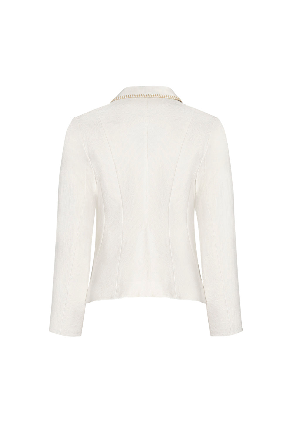 Stretch-cotton twill fitted jacket with detachable shoulder pads and a single waist fastening with copper hardware.