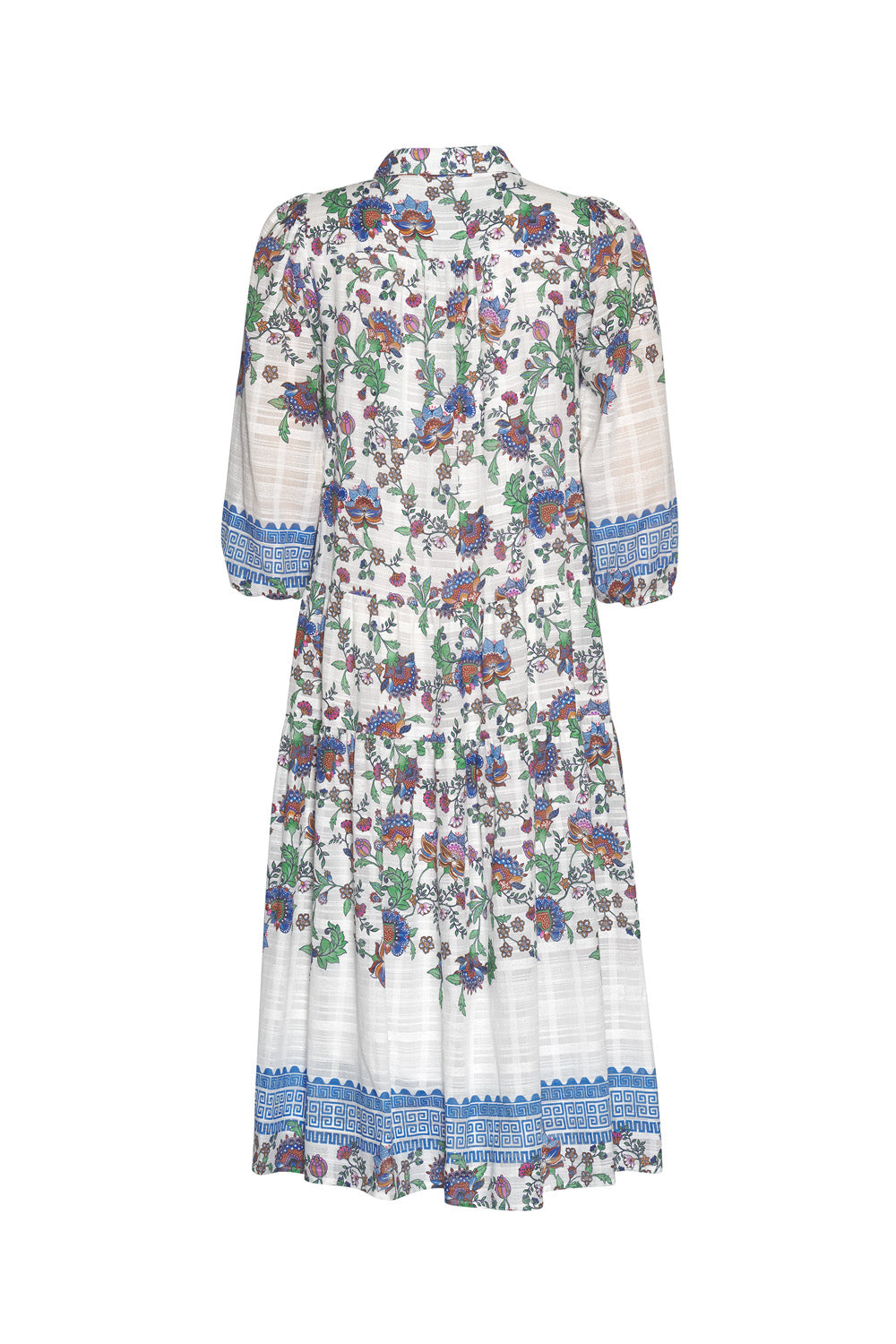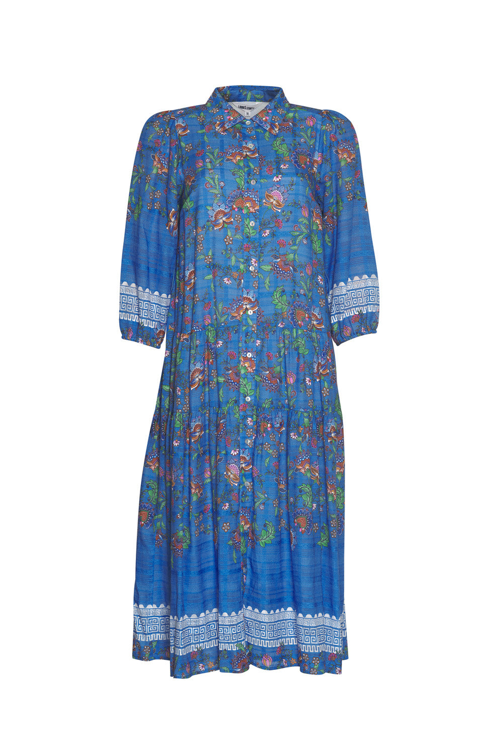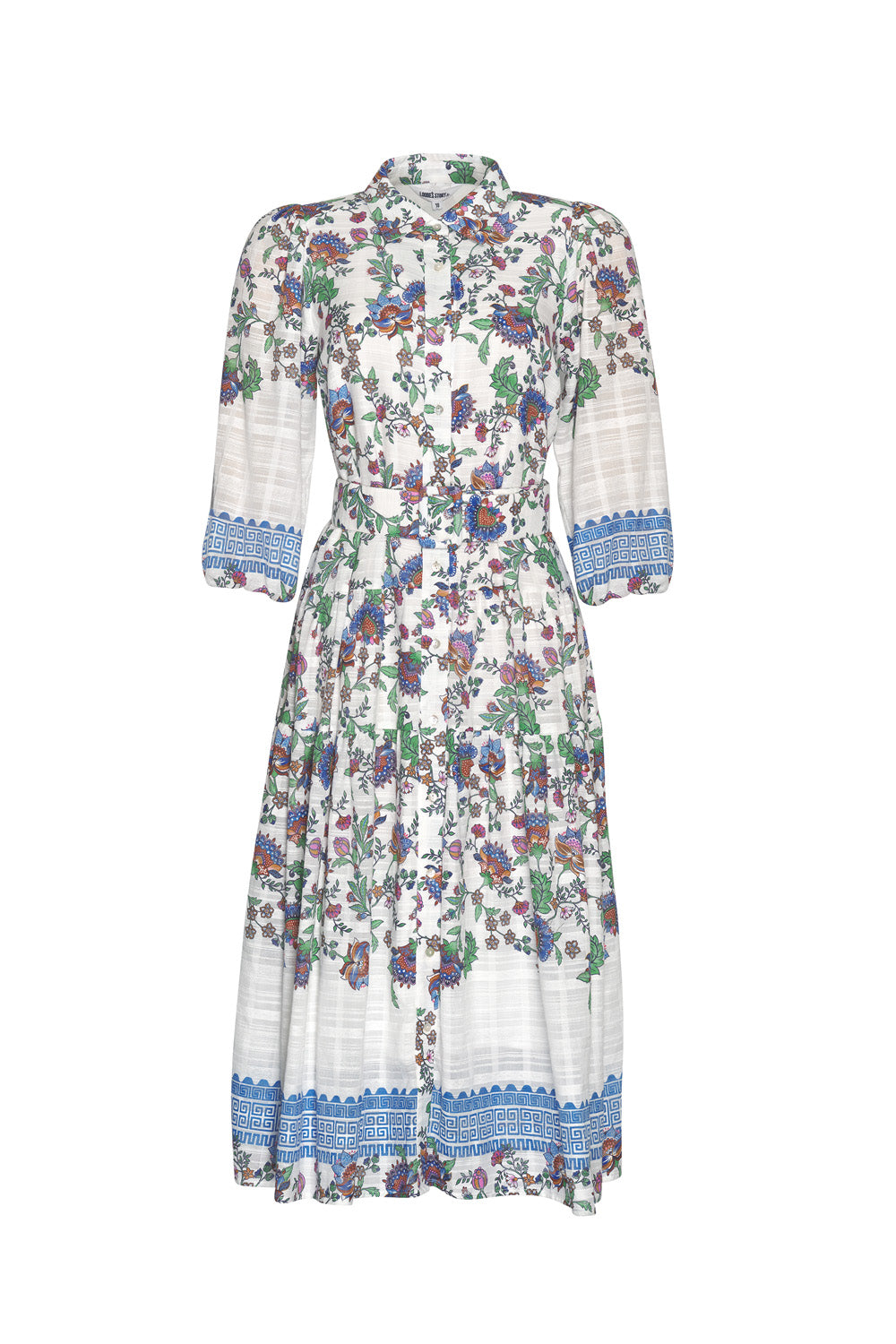 Button through shirt dress in a soft textured cotton, with 3/4 length sleeves and a dropped waist with a modern border print. Featuring matching self belt with covered slider buckle. Fully lined.