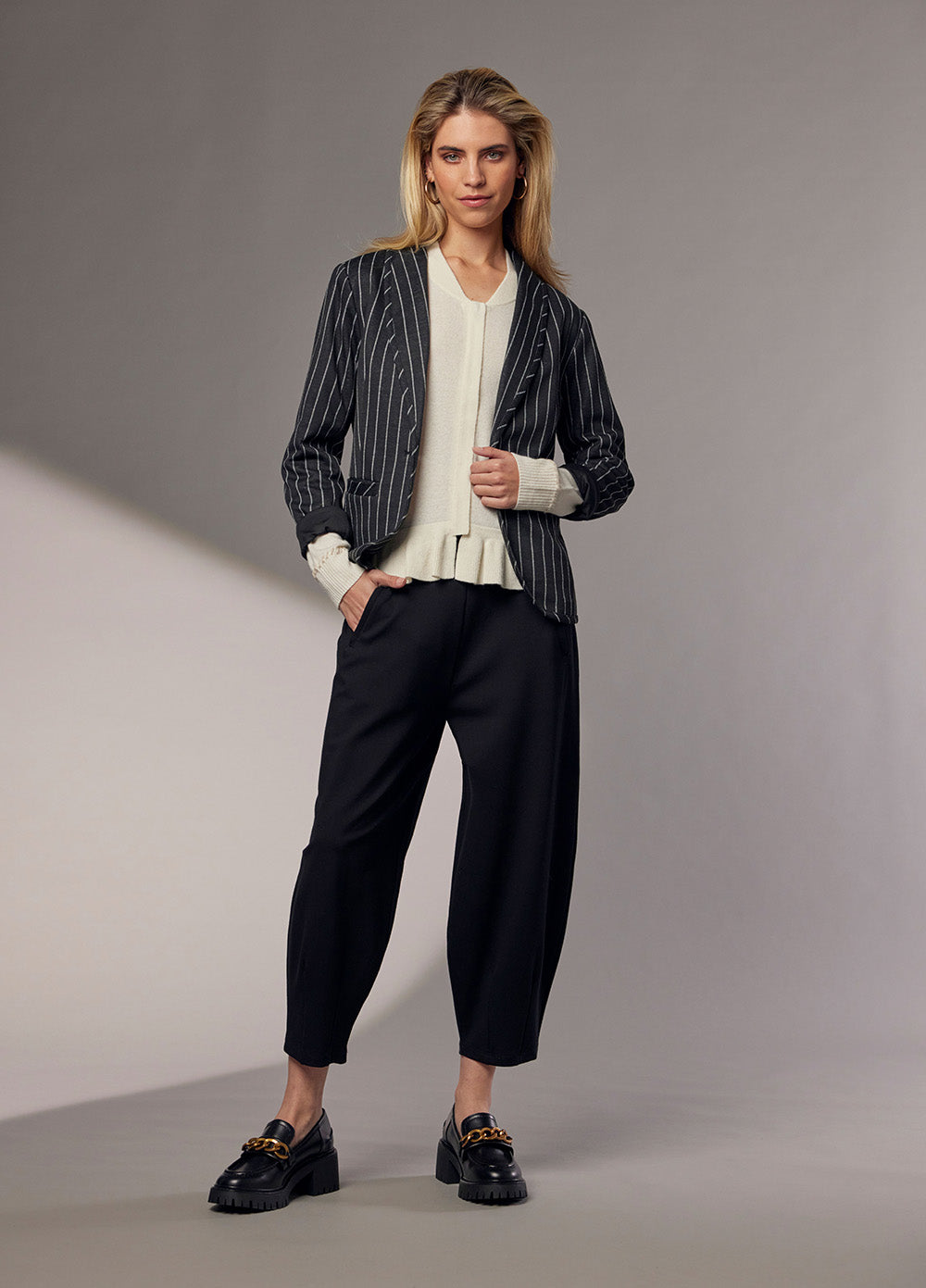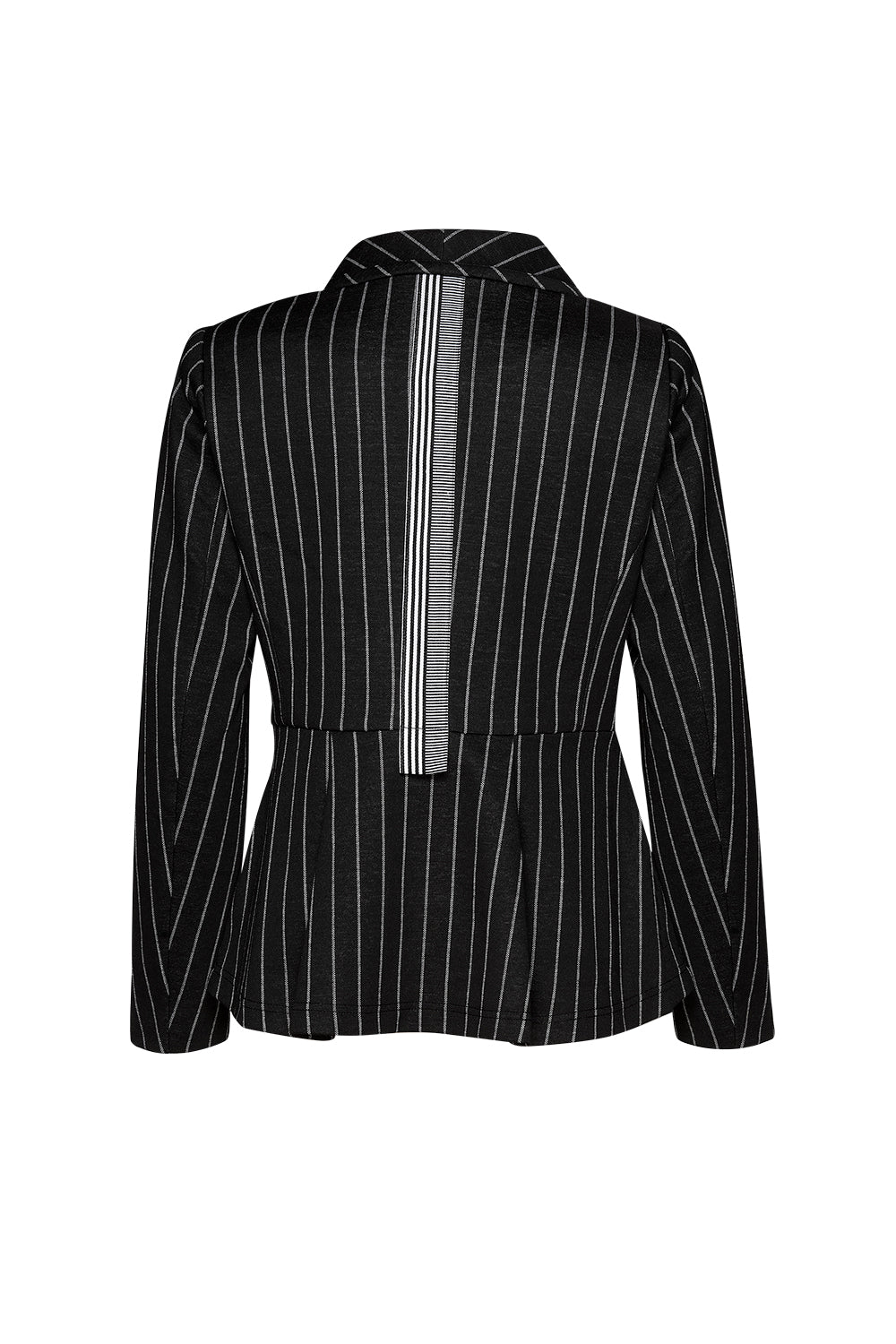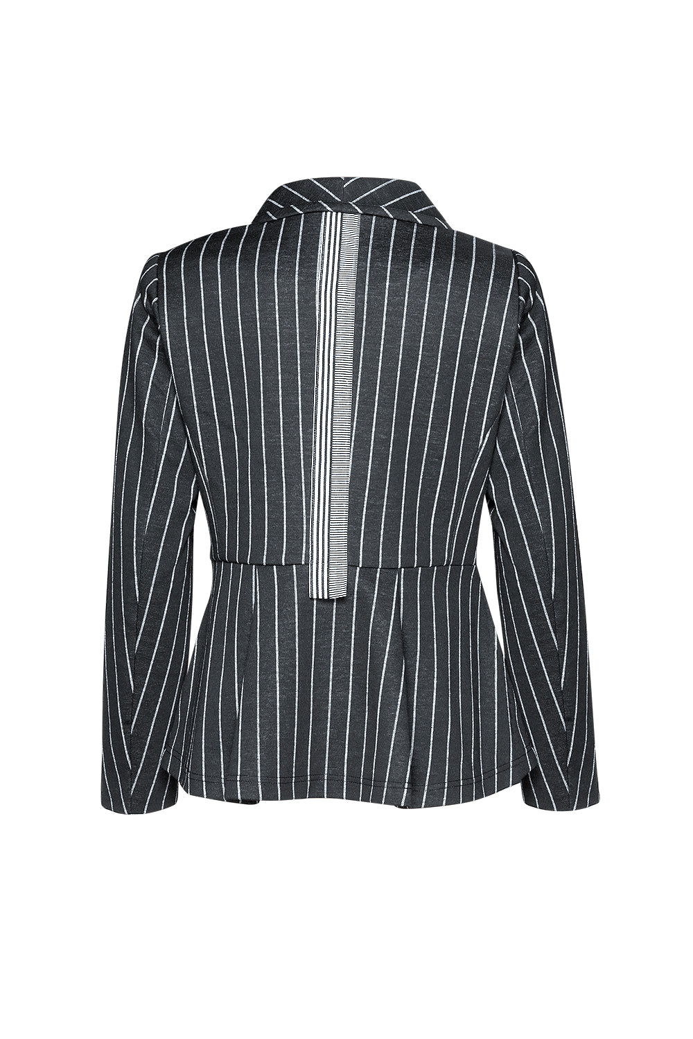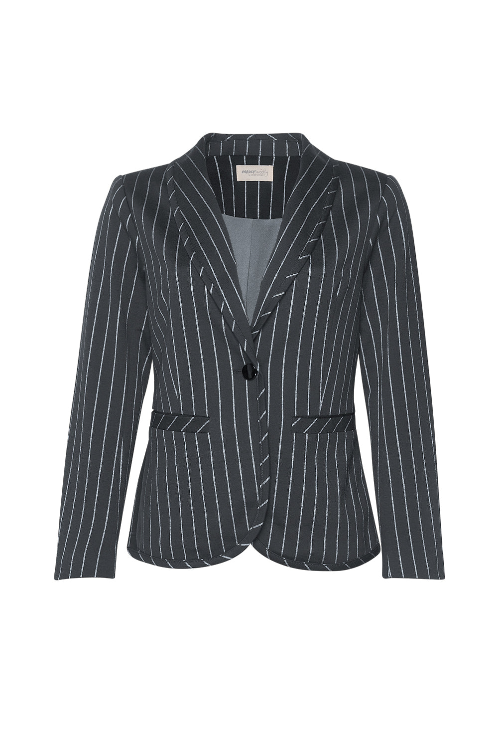 Soft and comfortable stretch stripe jacket with a shawl collar and curved hem. Tailored to the body for a flattering silhouette.