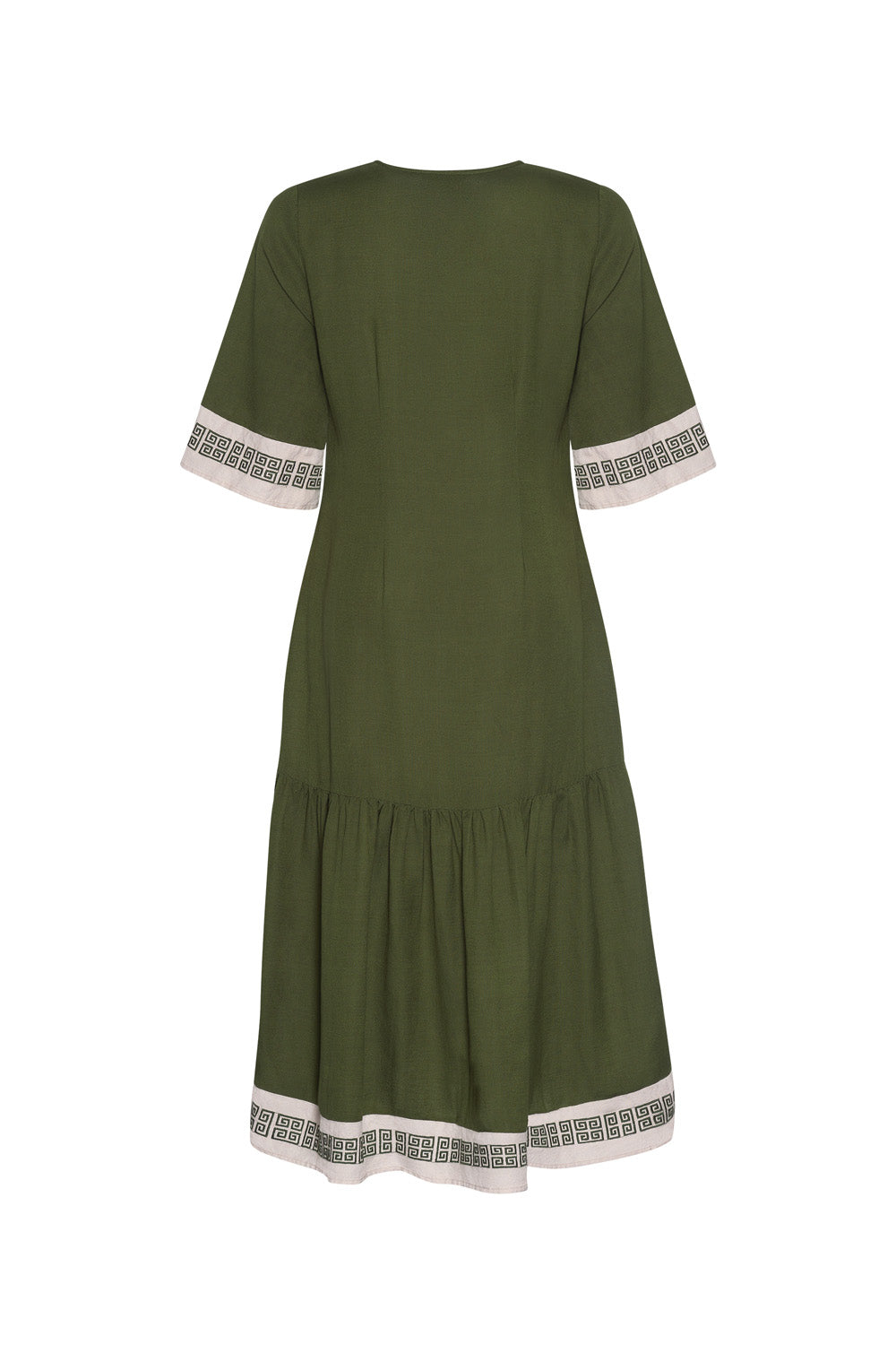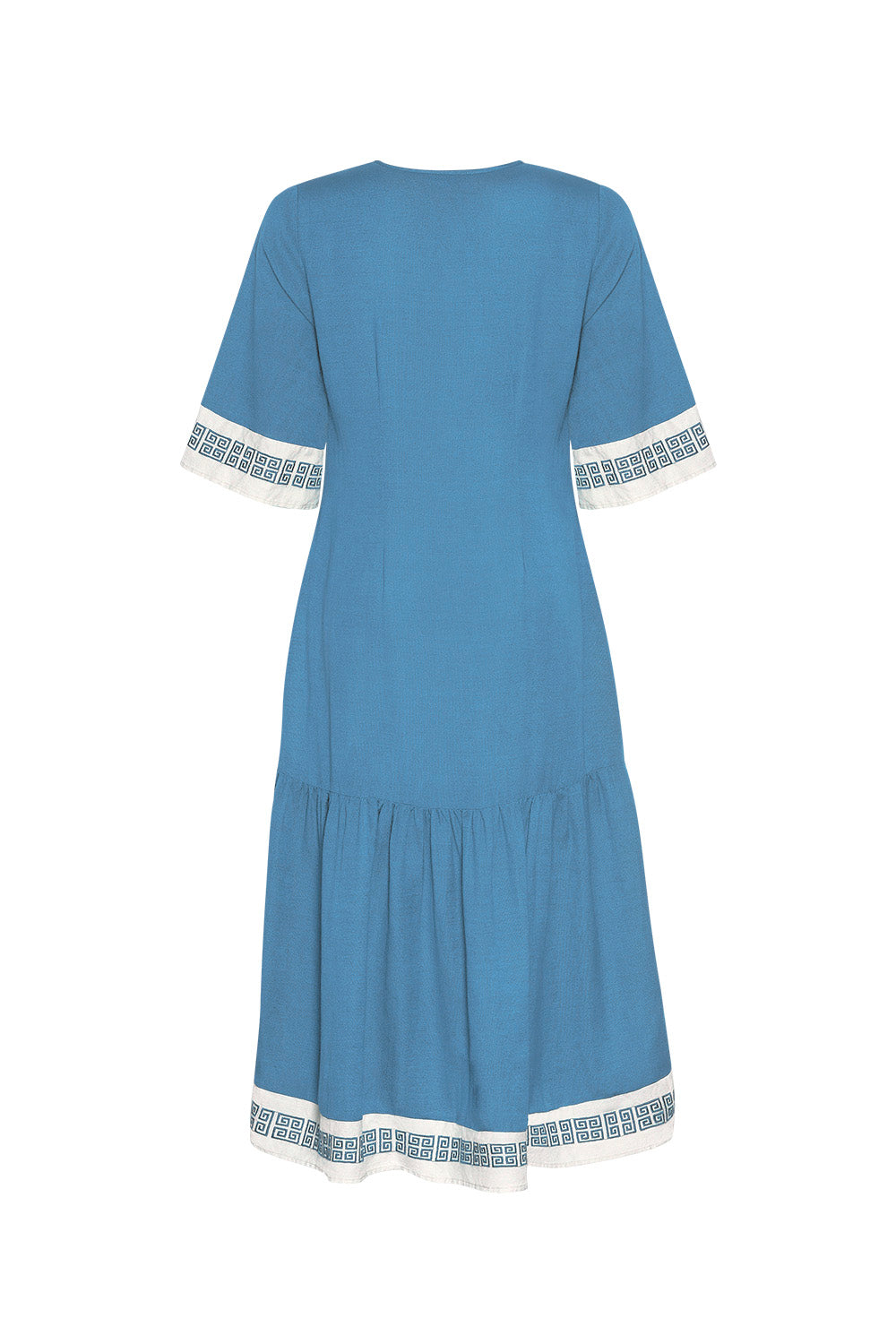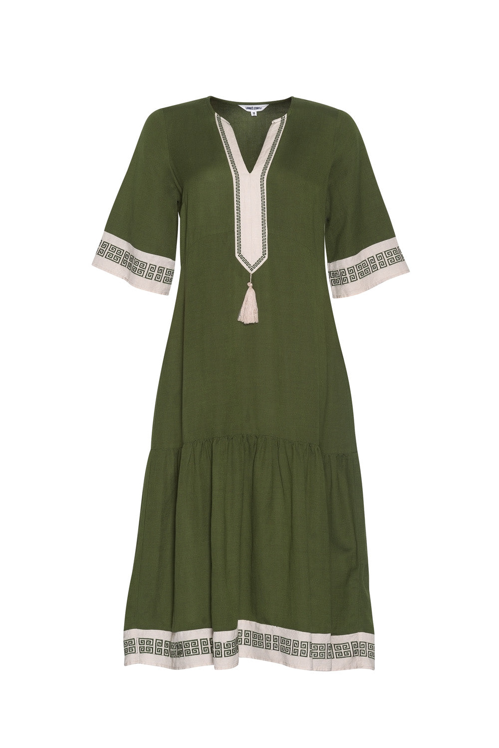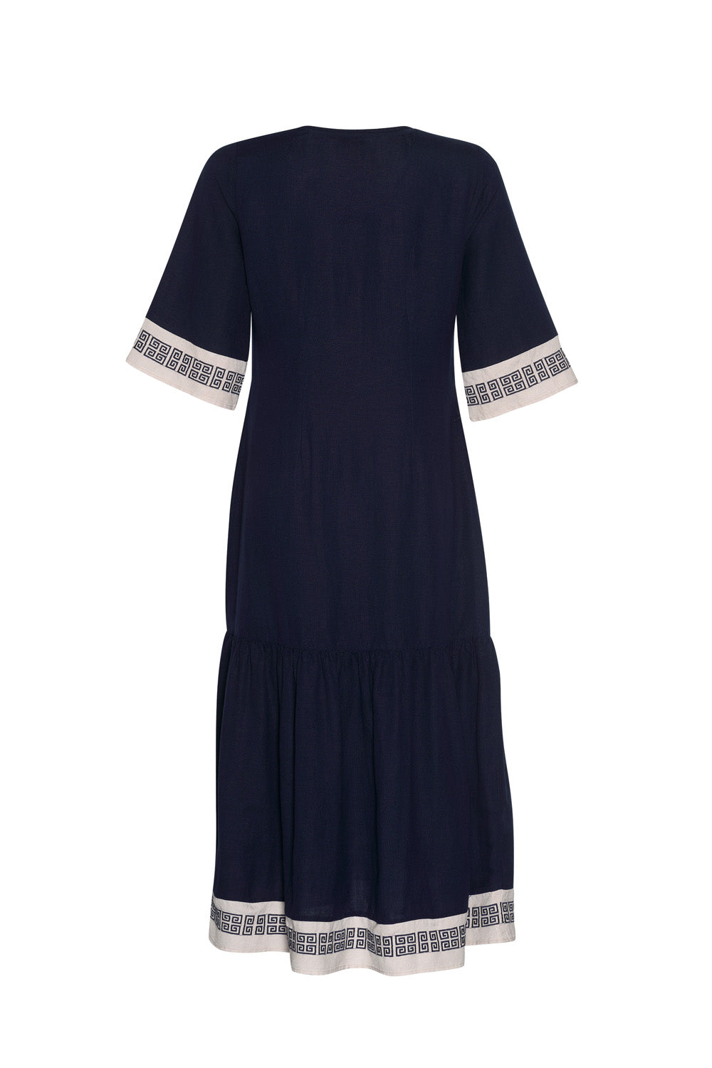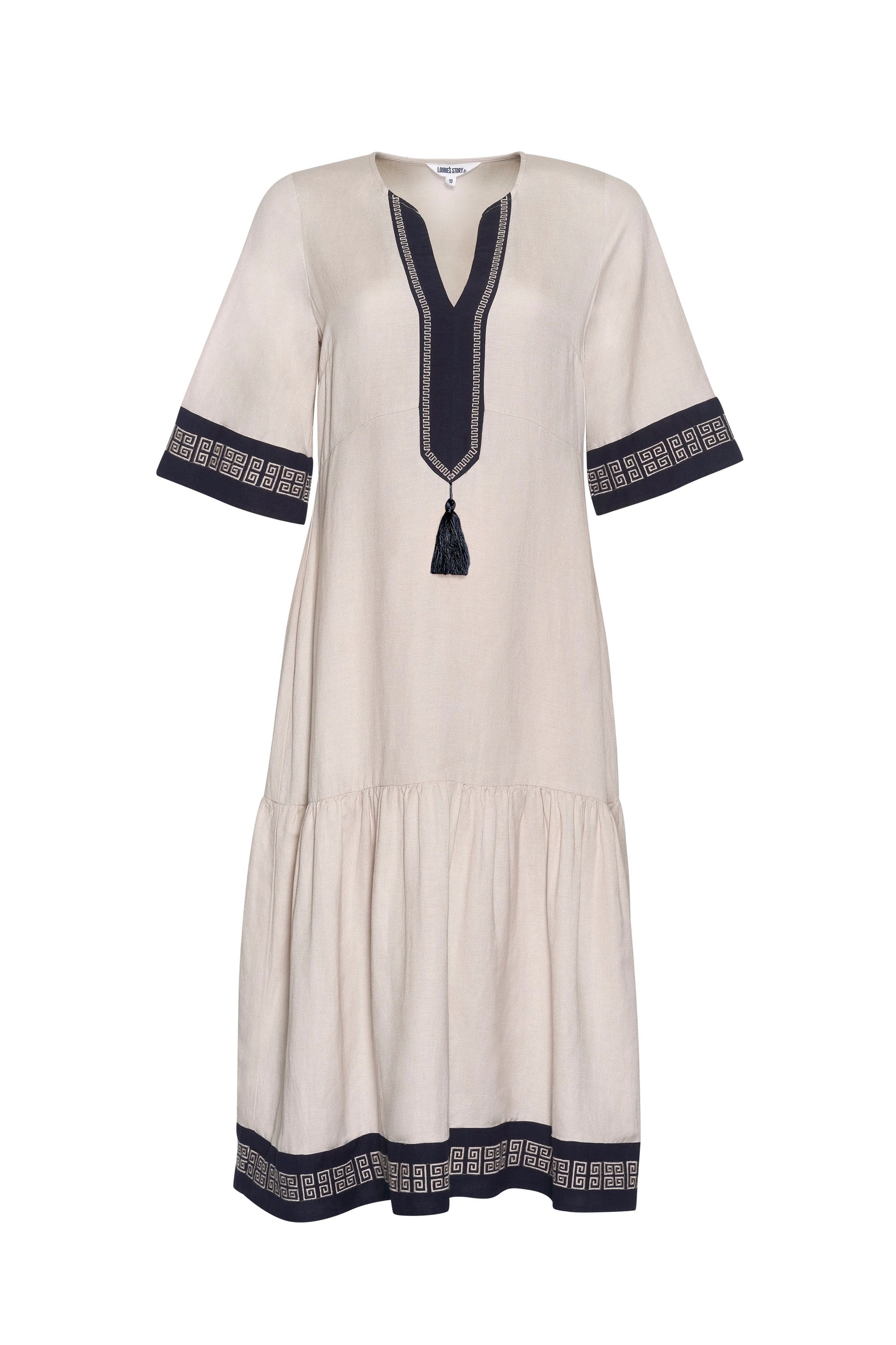 Slim fitting midi dress with a shaped front waist and back darts for a flattering fit. Featuring contrast panels with Greek embroidery detail at the sleeve opening, hem edge and deep placket, which is finished with a matching tassel.