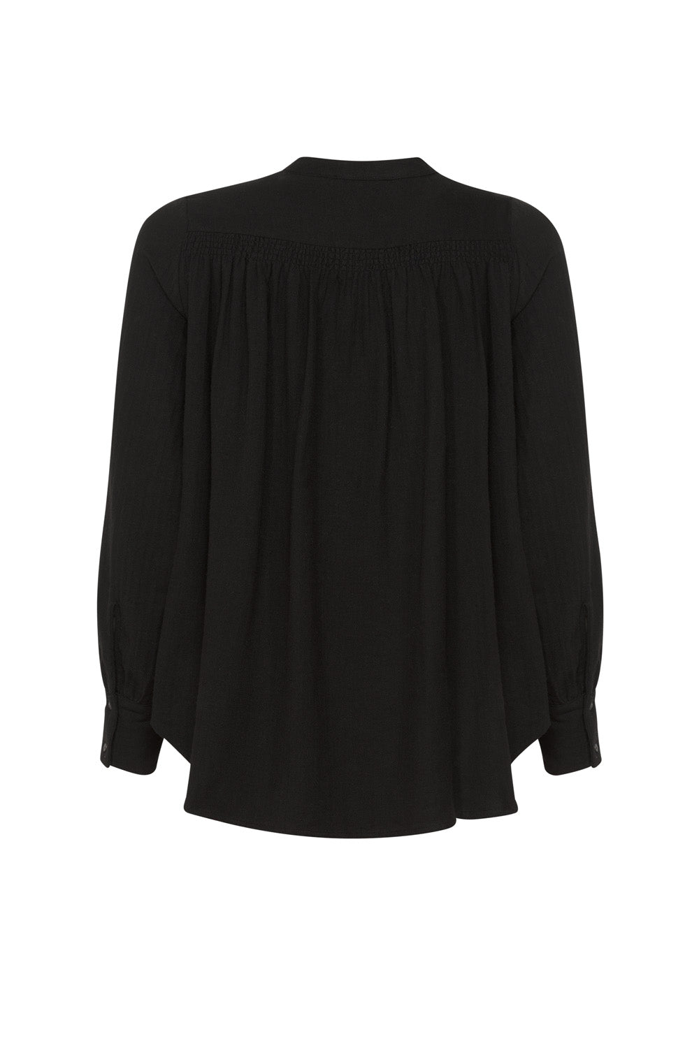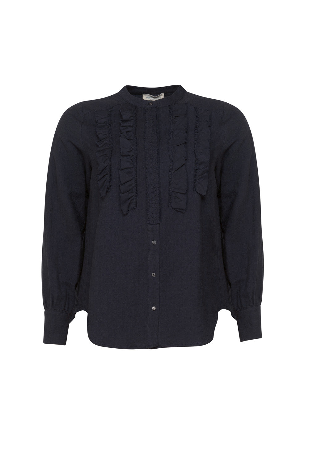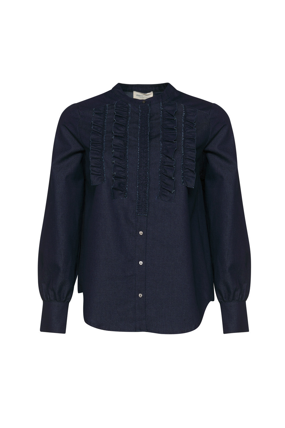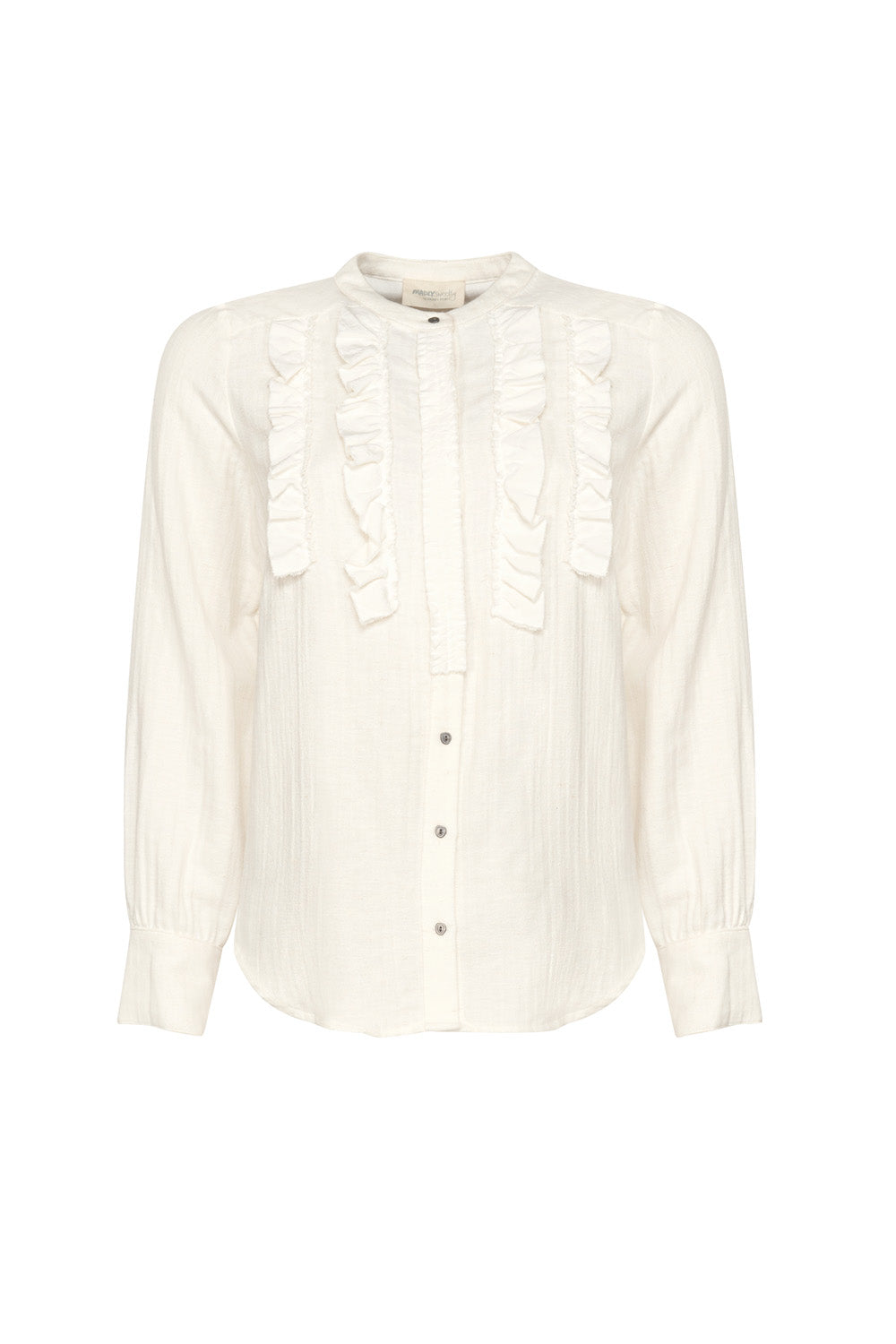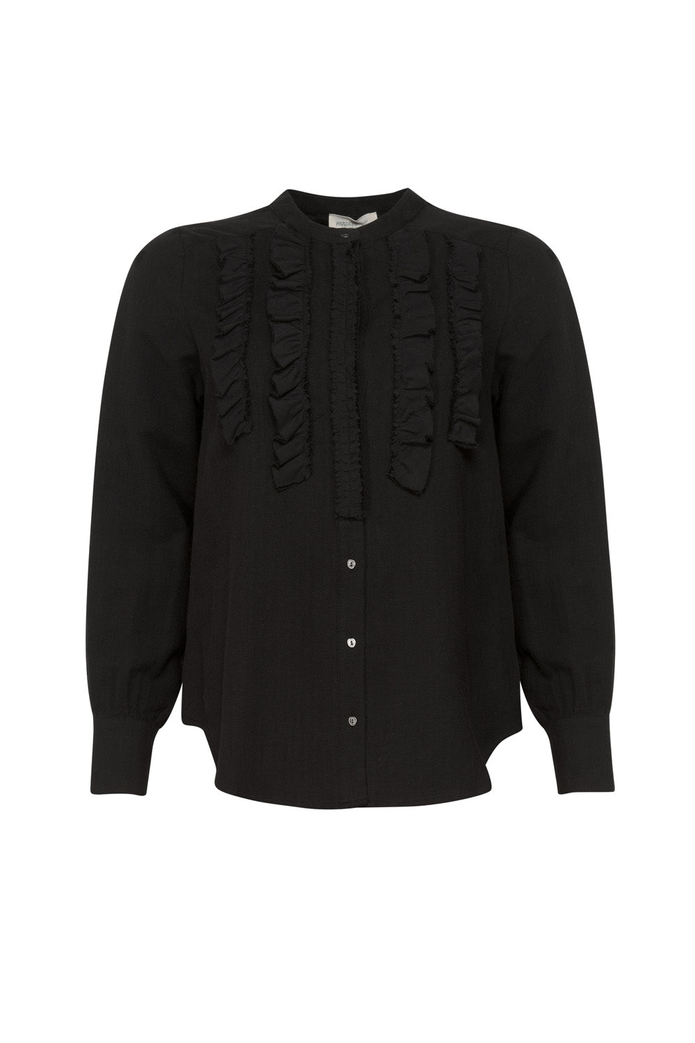 Button-up shirt in a bonded cotton, featuring raw-edged ruffle detail, and a shirred back yoke, with button-up cuffs and a rounded hem.