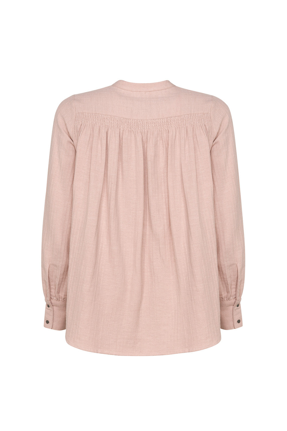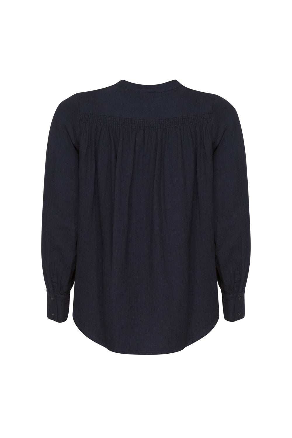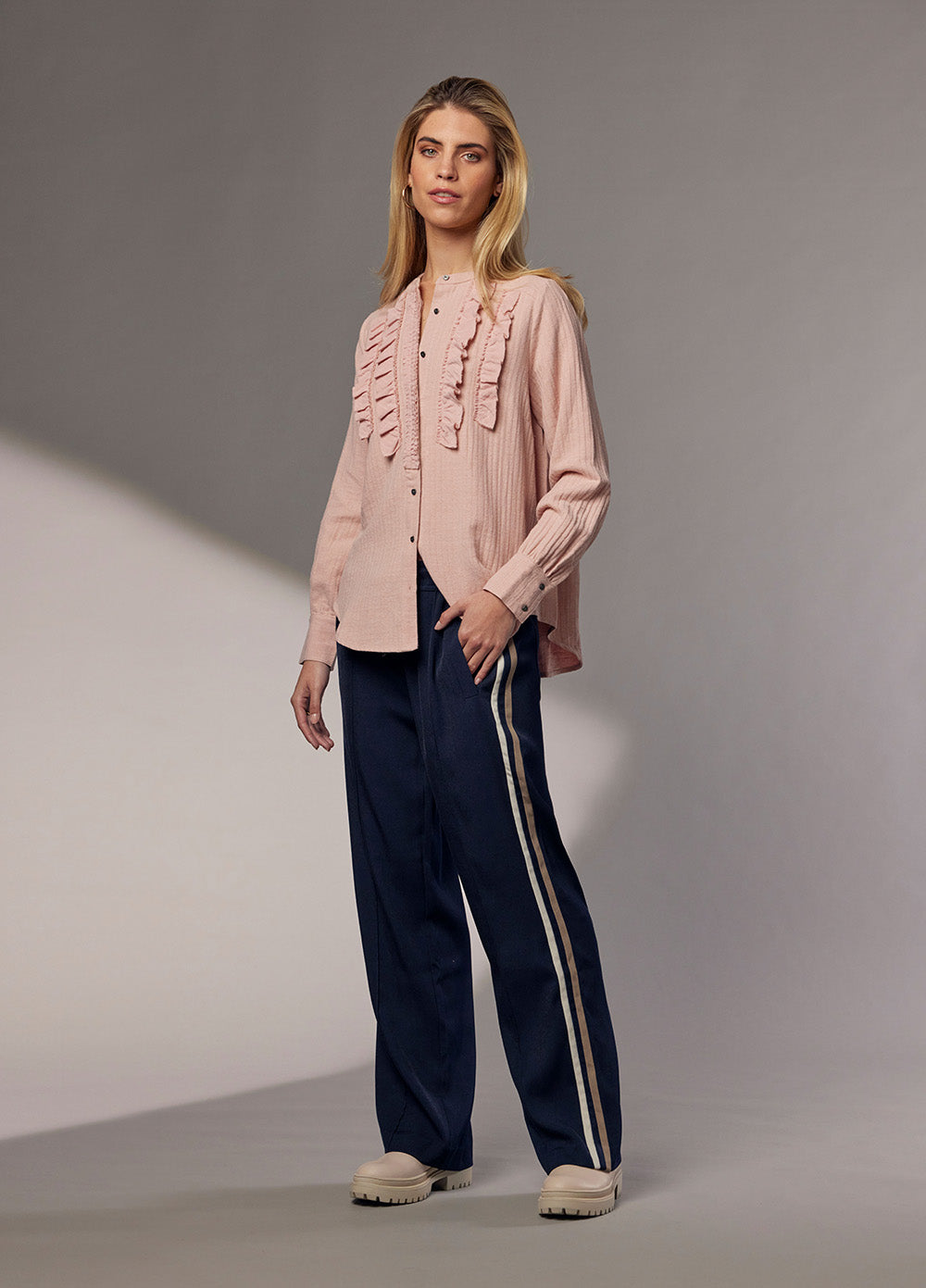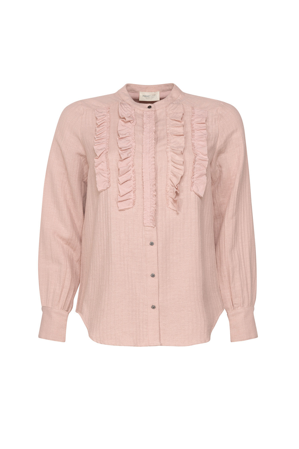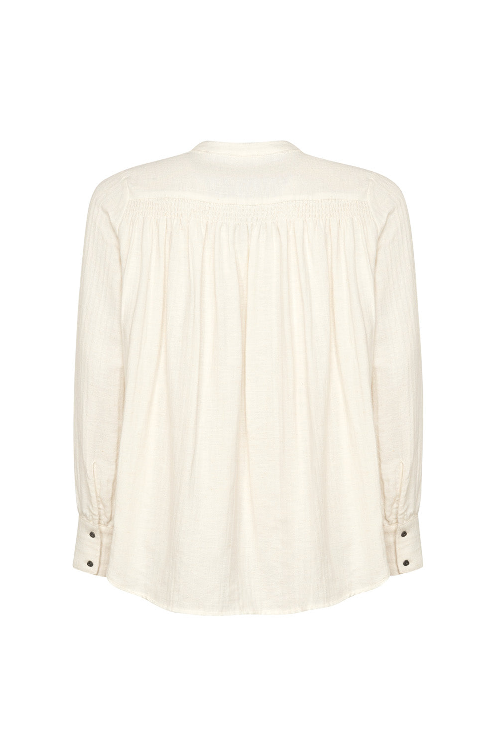 Button-up shirt in a bonded cotton, featuring raw-edged ruffle detail, and a shirred back yoke, with button-up cuffs and a rounded hem.