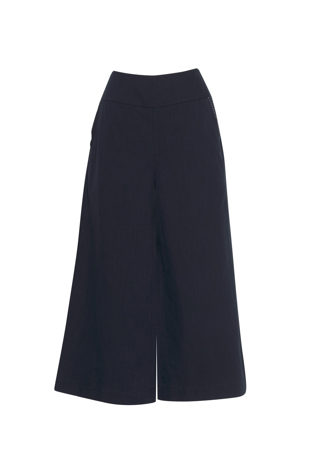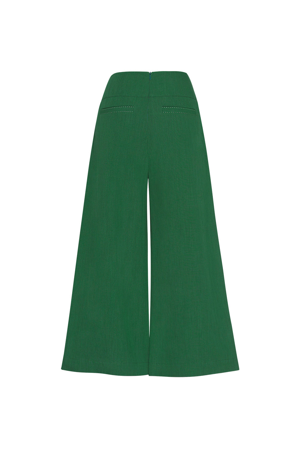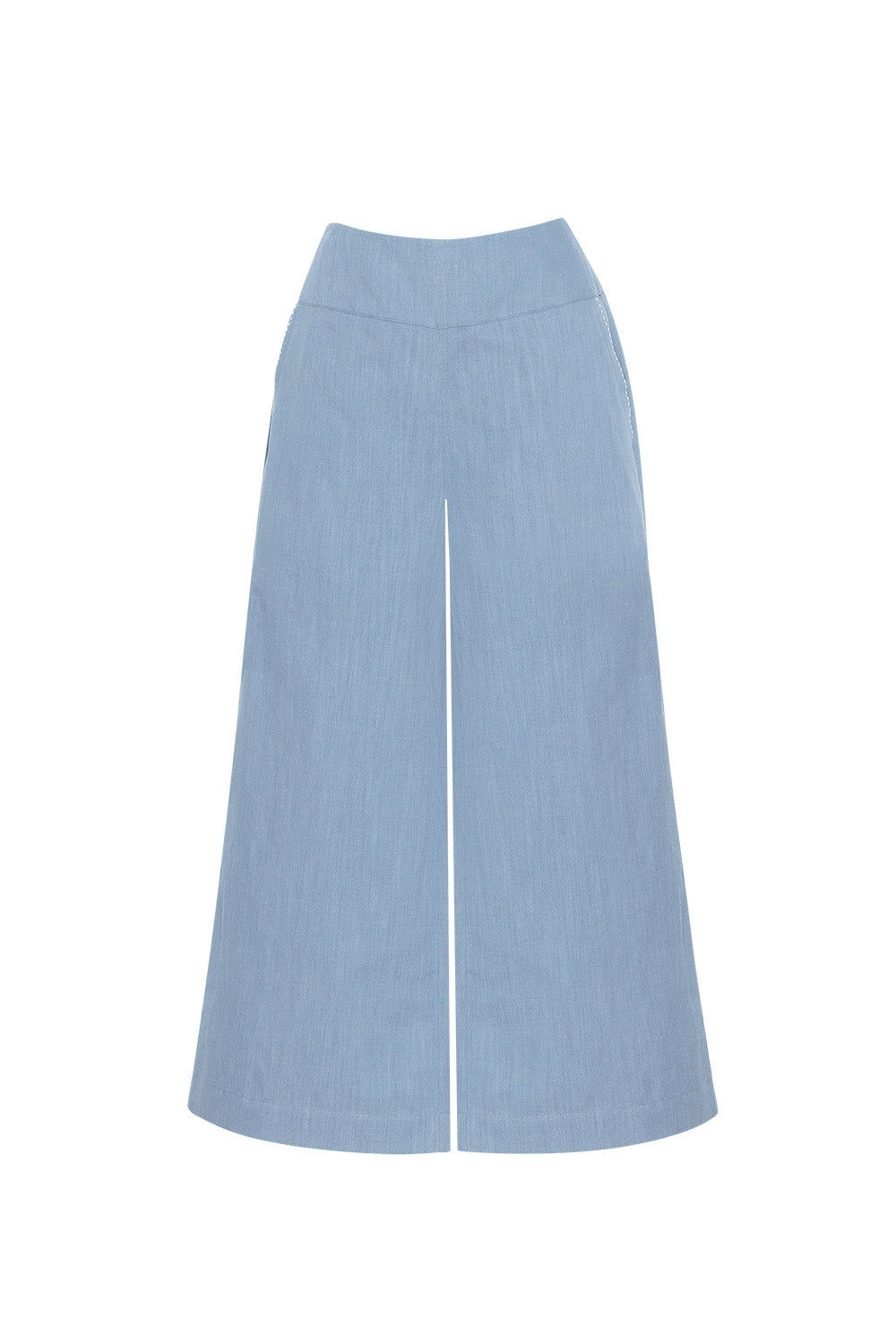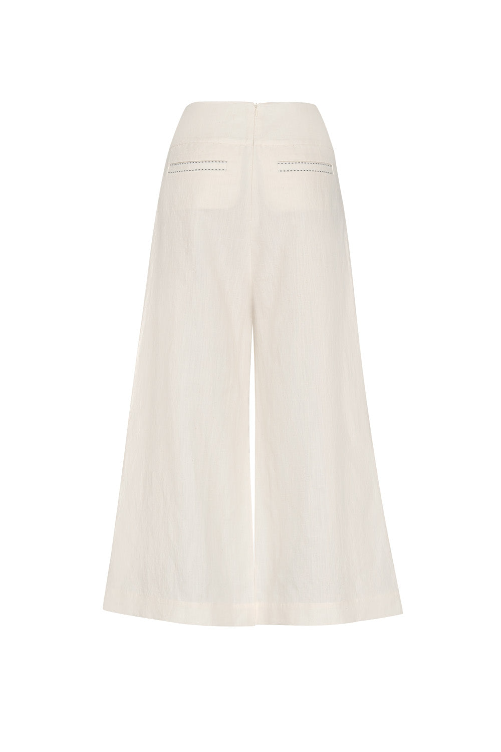 Cropped wide-leg pant with a deep waistband and zip at centre back, featuring embroidered stitching.