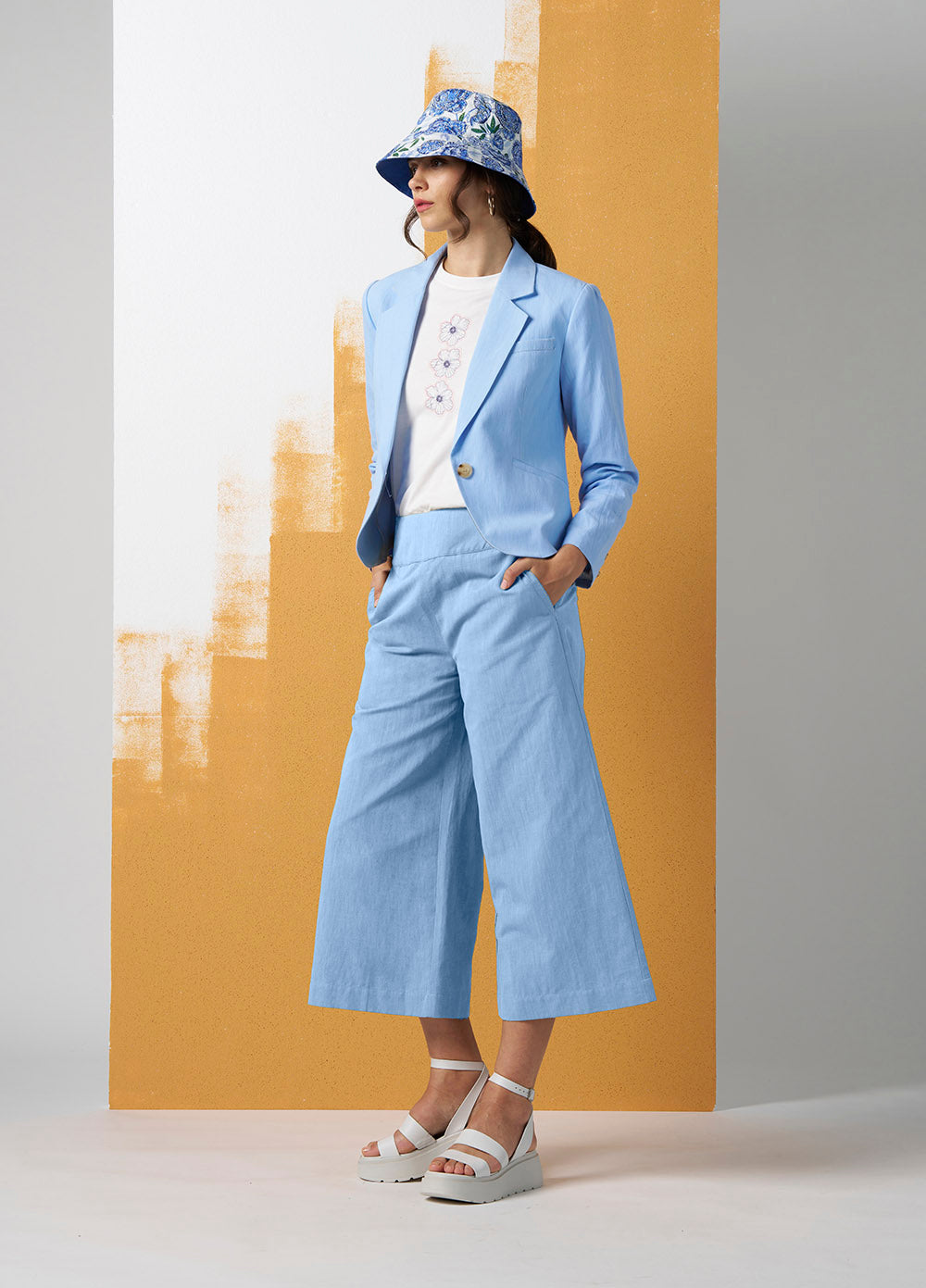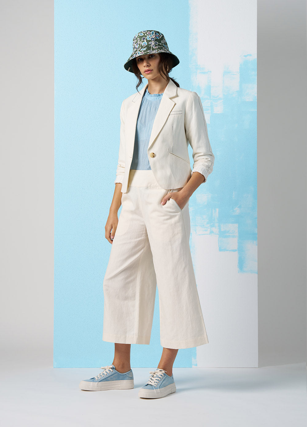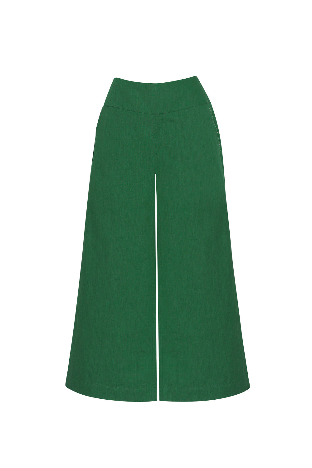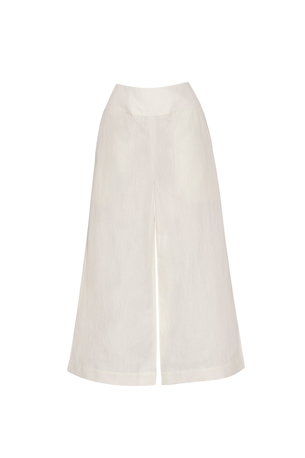 Cropped wide-leg pant with a deep waistband and zip at centre back, featuring embroidered stitching.