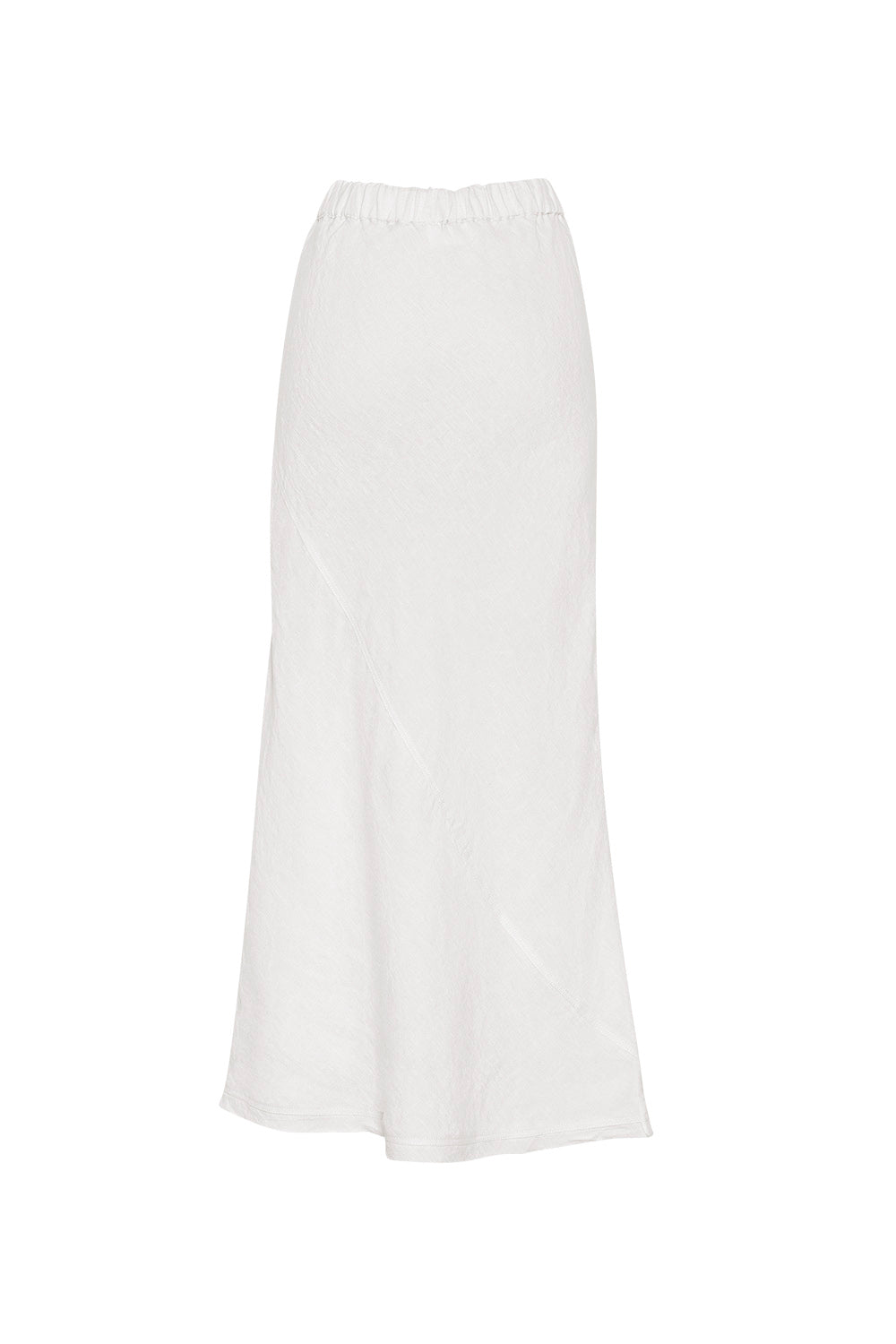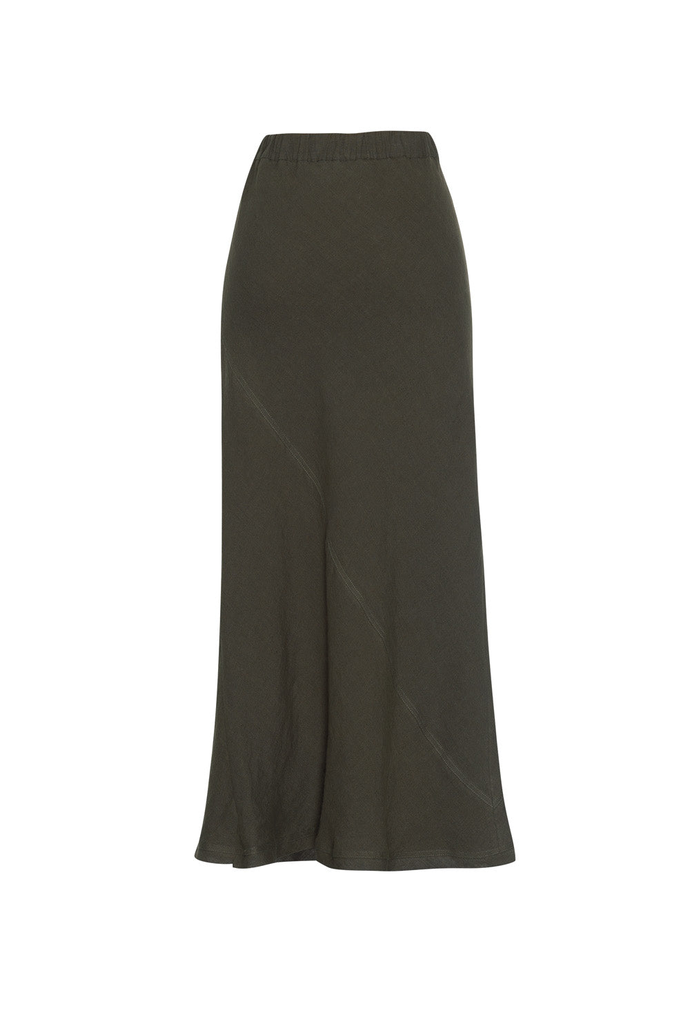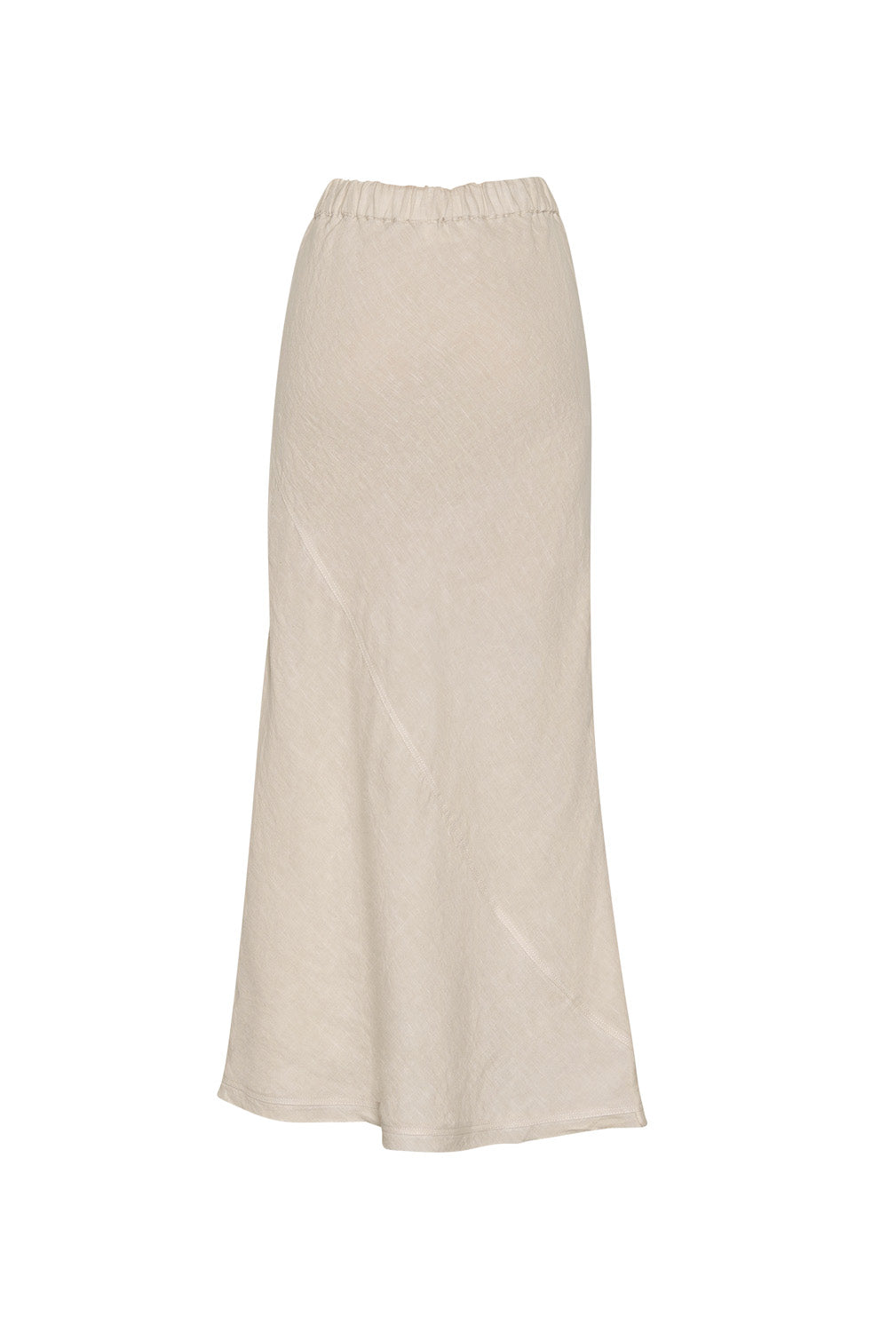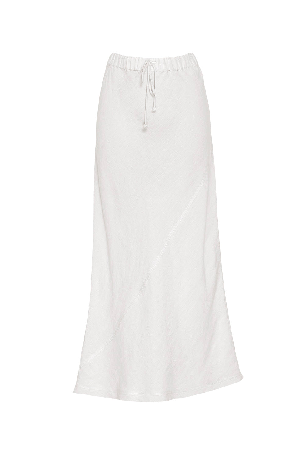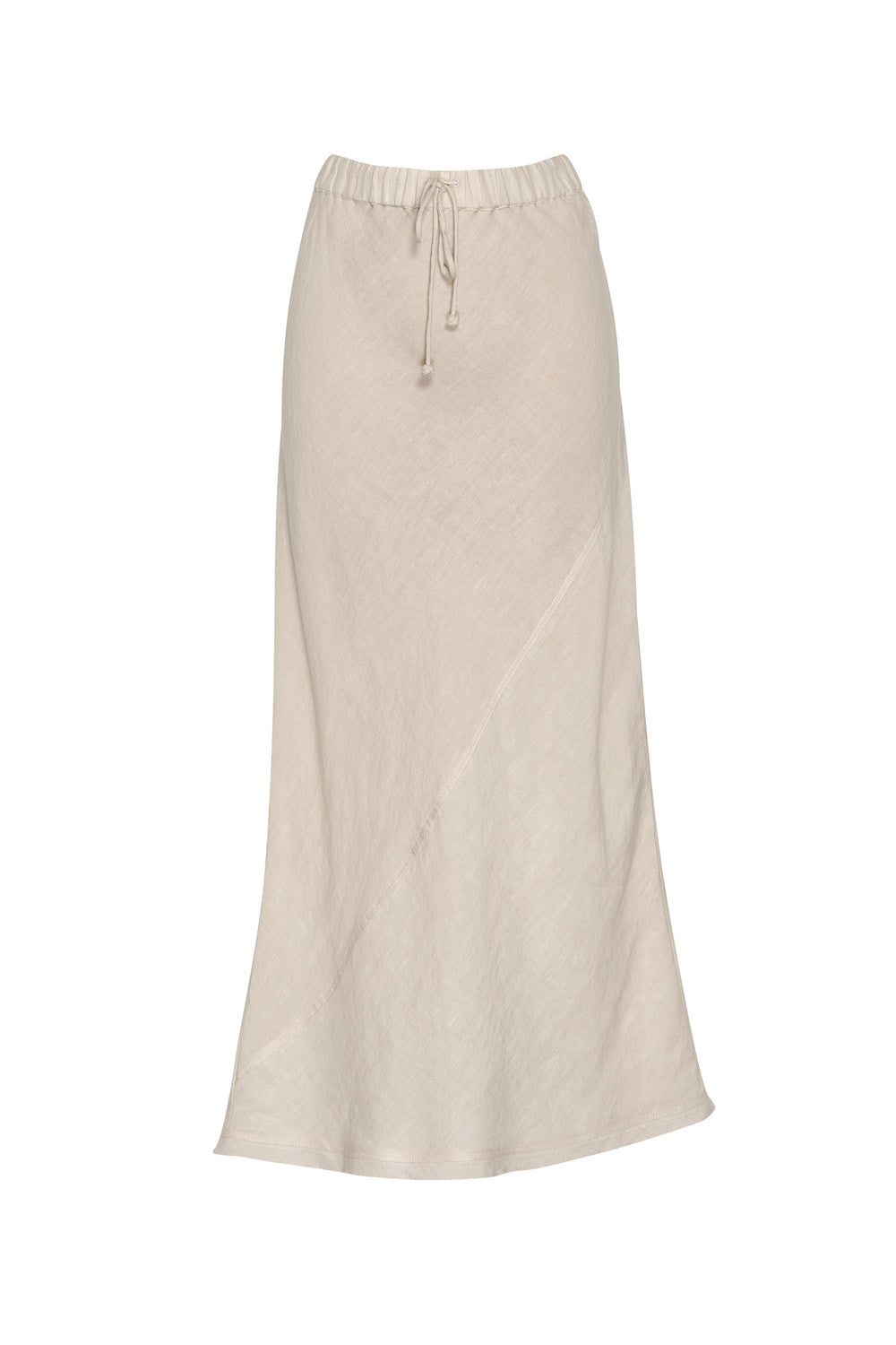 Midi length bias skirt with a diagonal seam, elasticated waist, with a self tie with knotted ends.