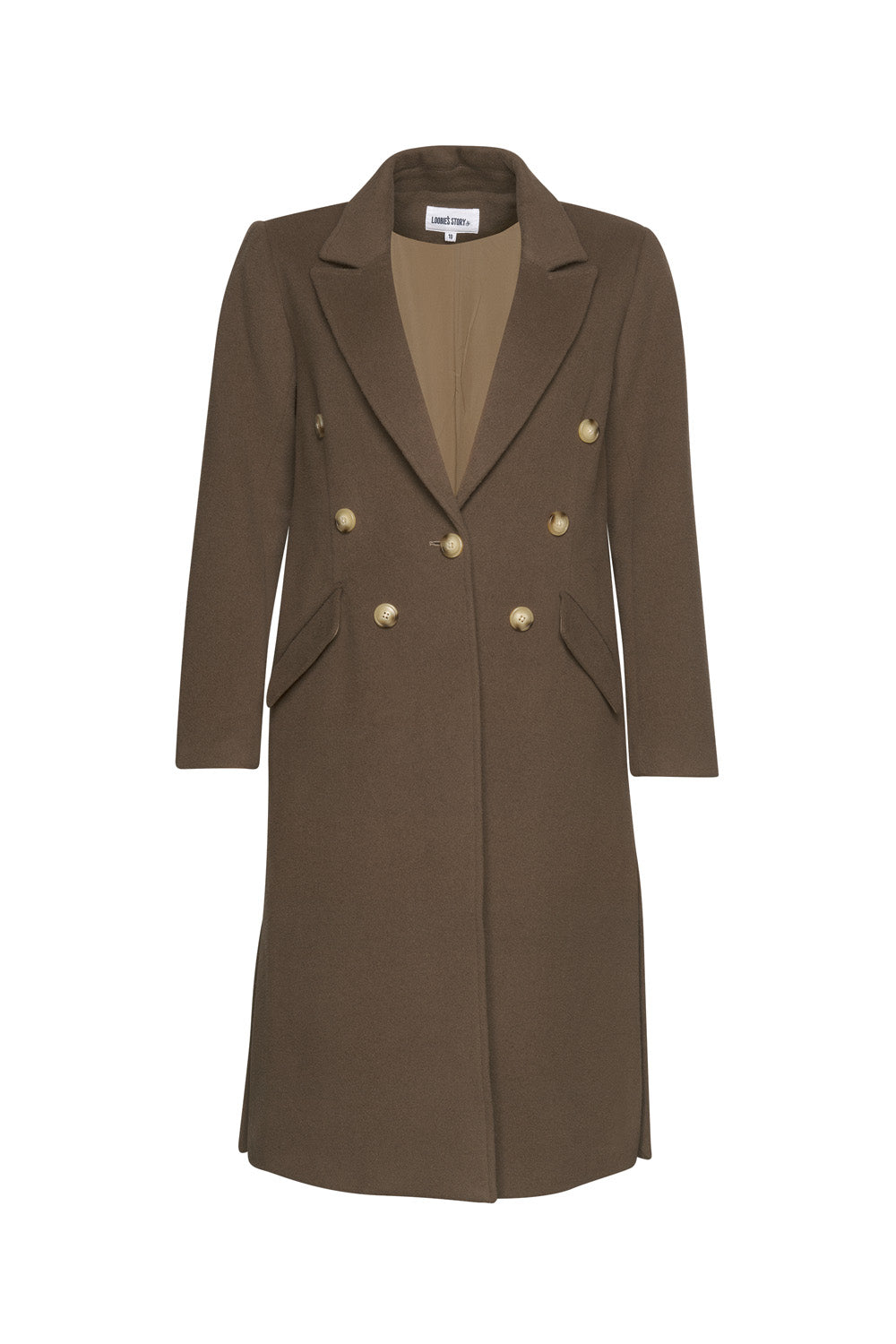 Single breasted longline coat with angled pockets and side splits. Fully lined.