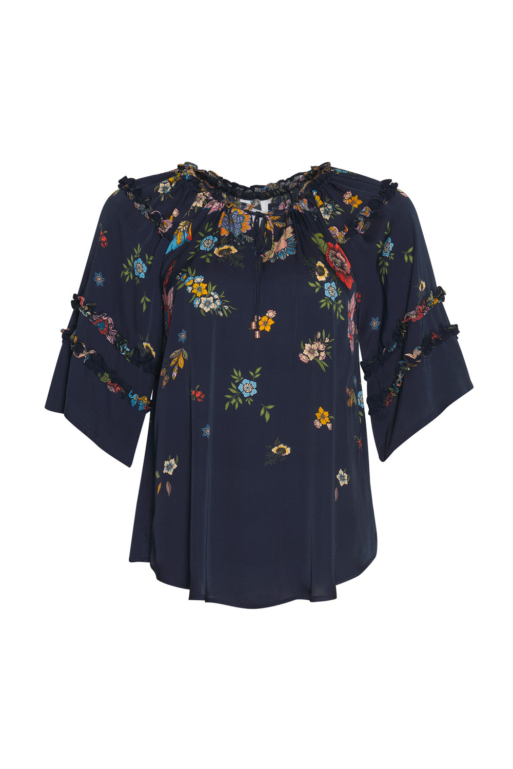 Relaxed fit, raglan blouse with a tie neckline, featuring yoryu ruffles stitched around neckline and around sleeves.