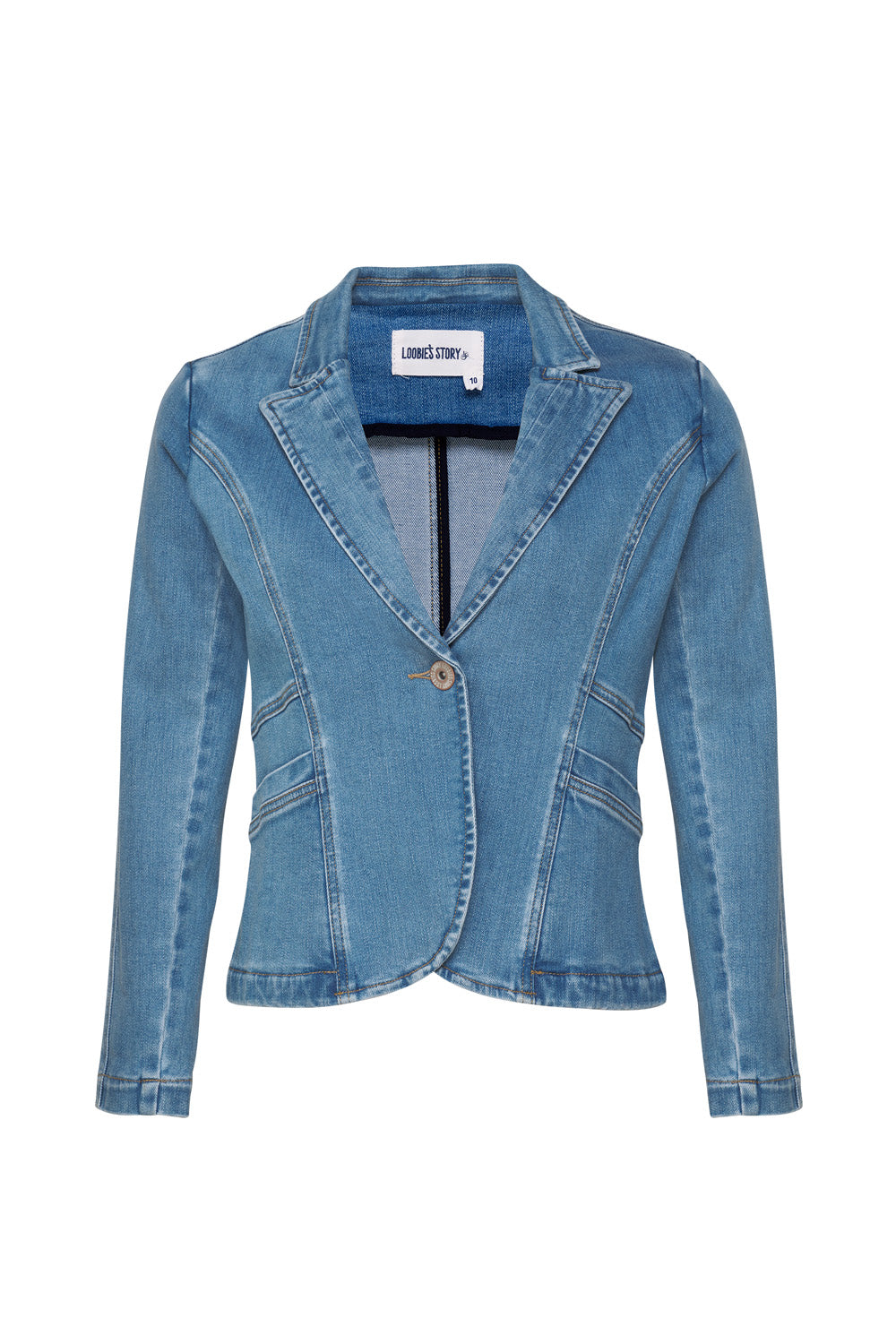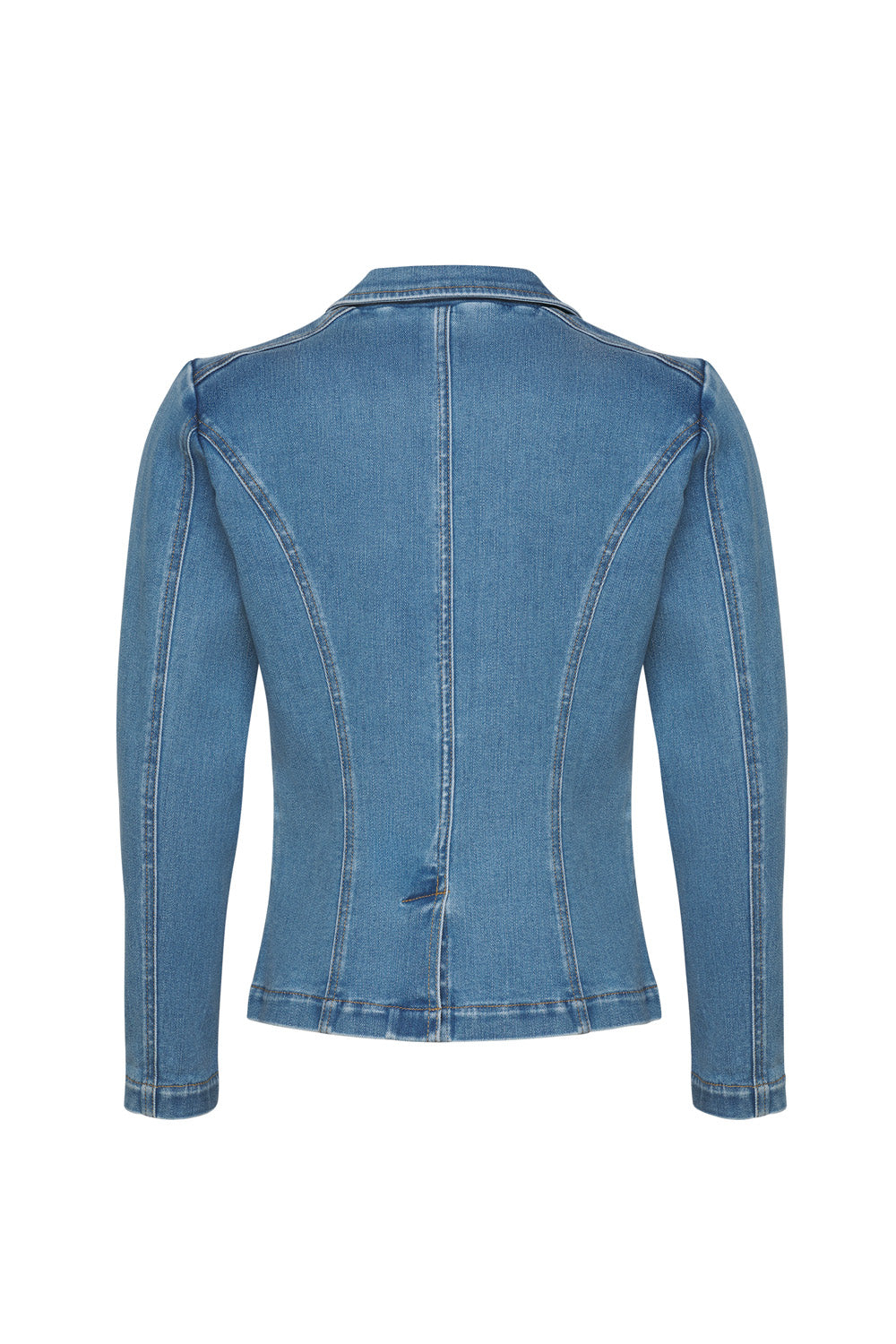 Stretch-denim fitted jacket with detachable shoulder pads and a single waist fastening with copper hardware.
