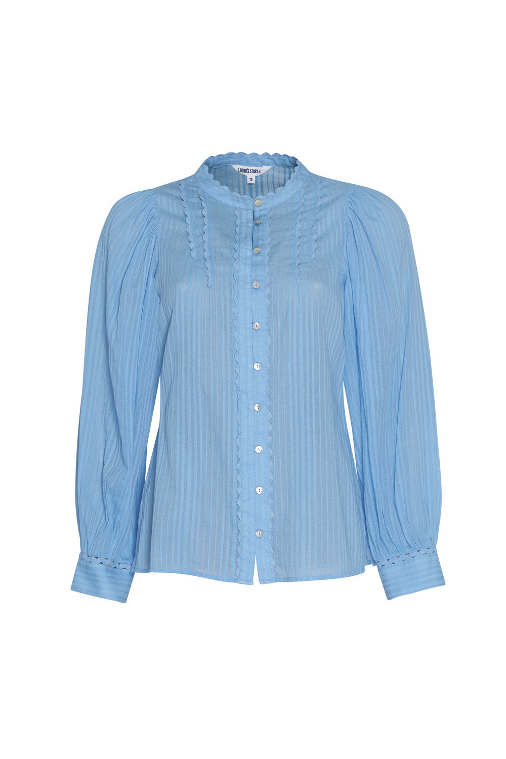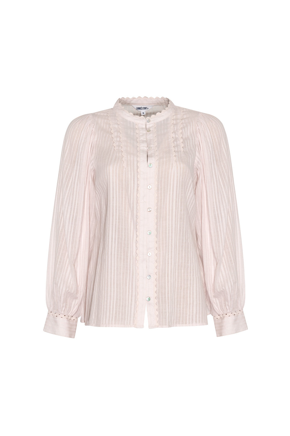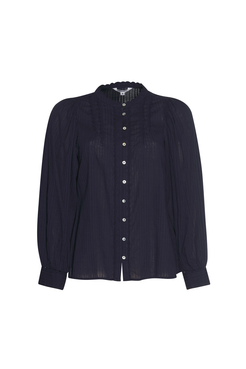 Button through blouse with delicate shell button and loops. Featuring scalloped cotton trim detail around the collar, placket, cuffs and inserted into the front body.