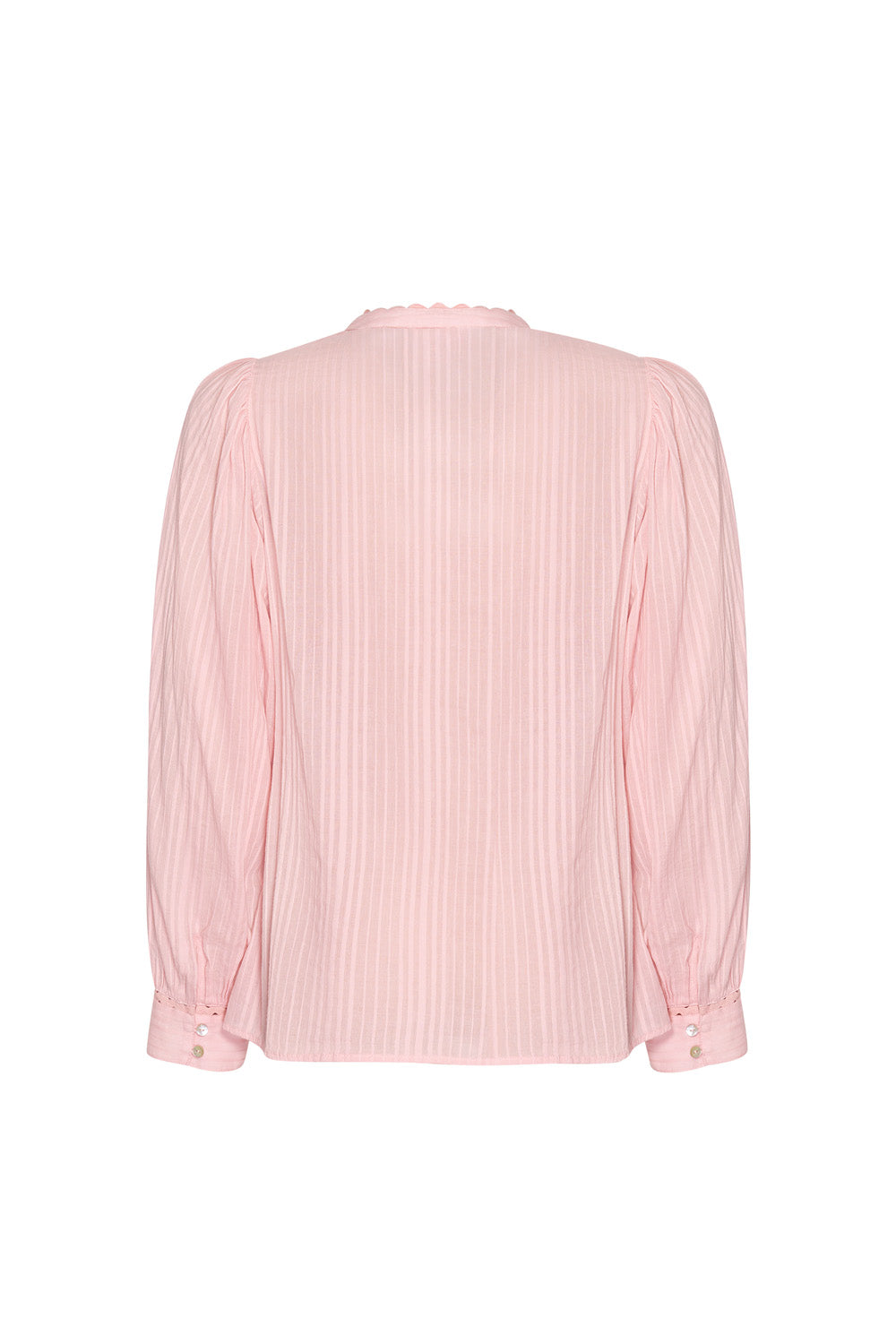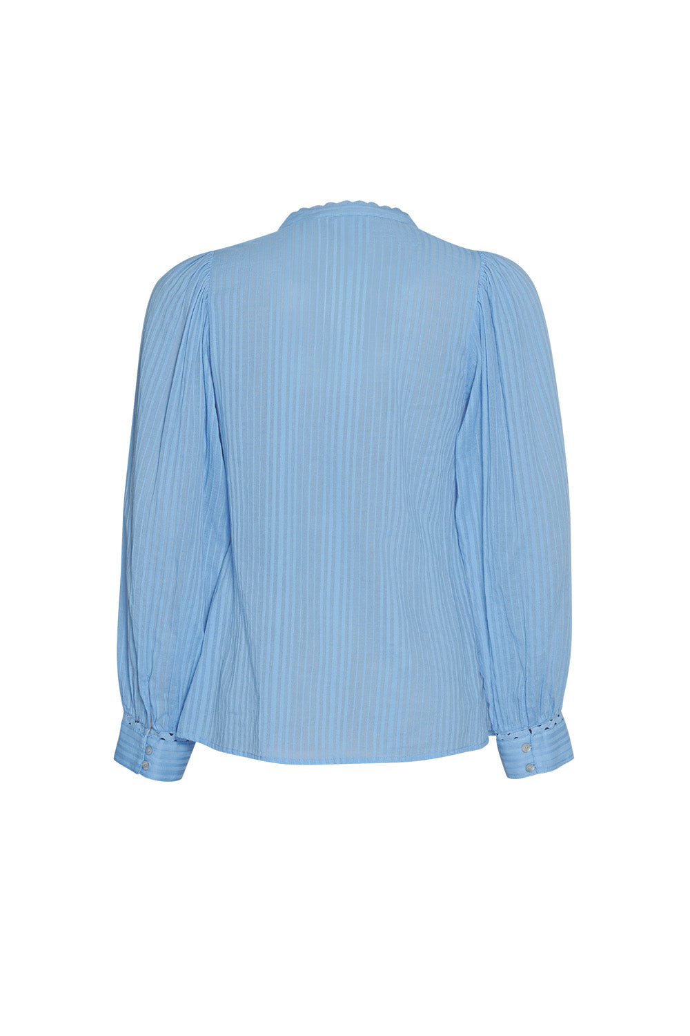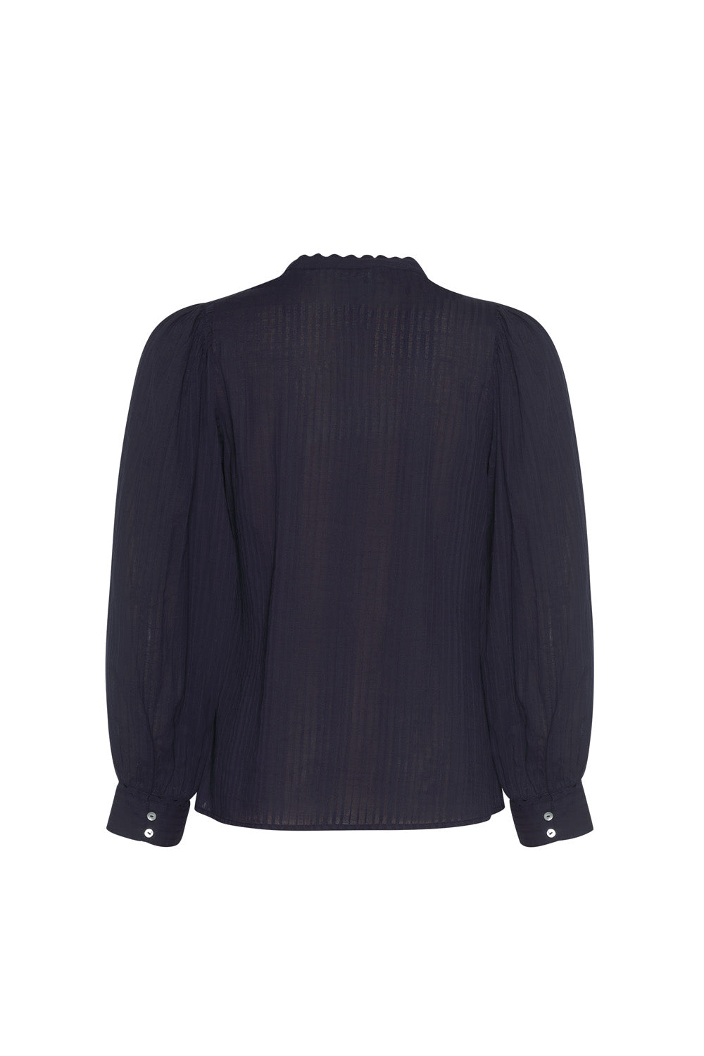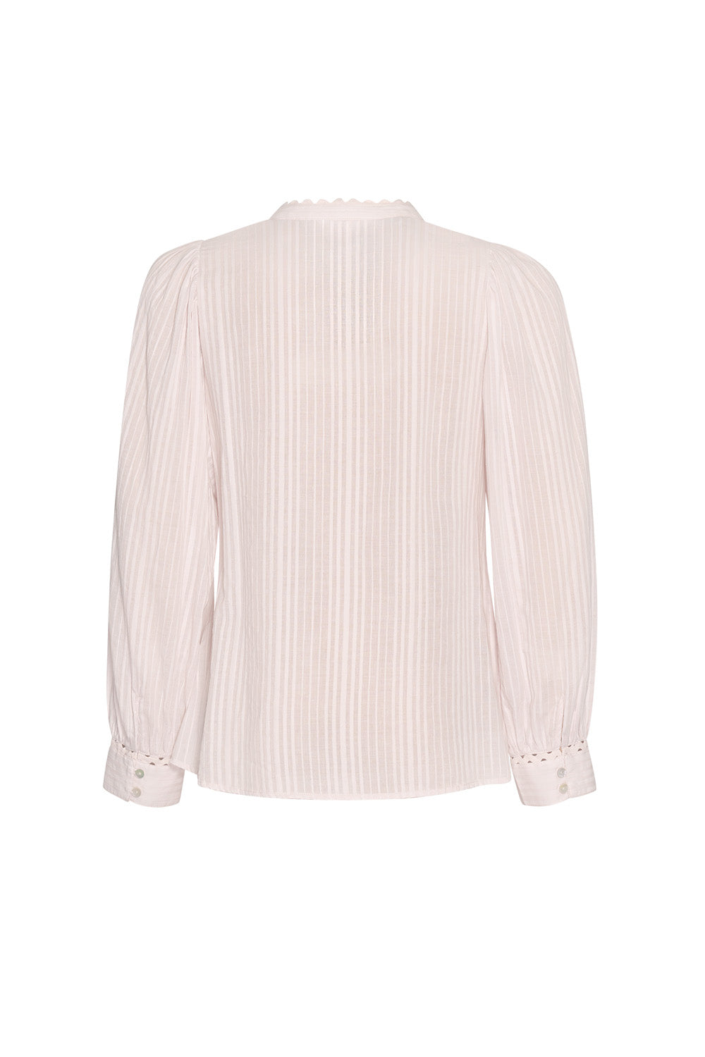 Button through blouse with delicate shell button and loops. Featuring scalloped cotton trim detail around the collar, placket, cuffs and inserted into the front body.