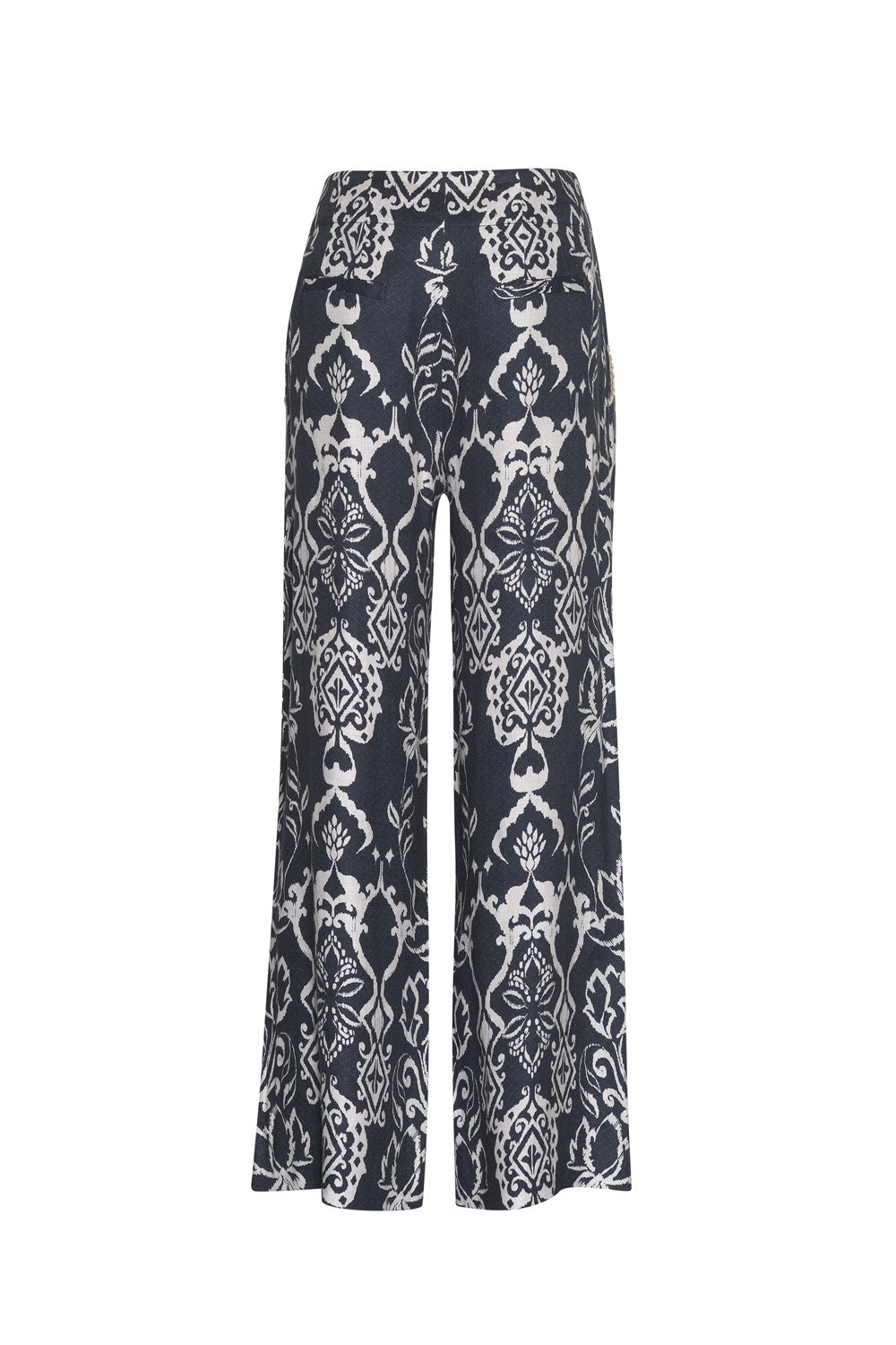 Wide-leg pant in a stretch-linen blend, with a mirrored placement print. Featuring natural twisted tape trim on the front side pockets, with functional zip fly at the front.