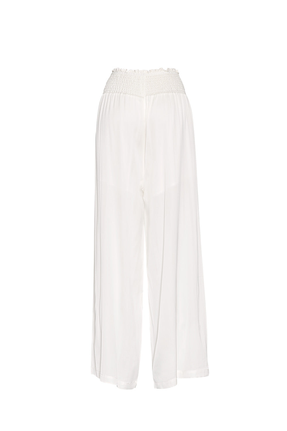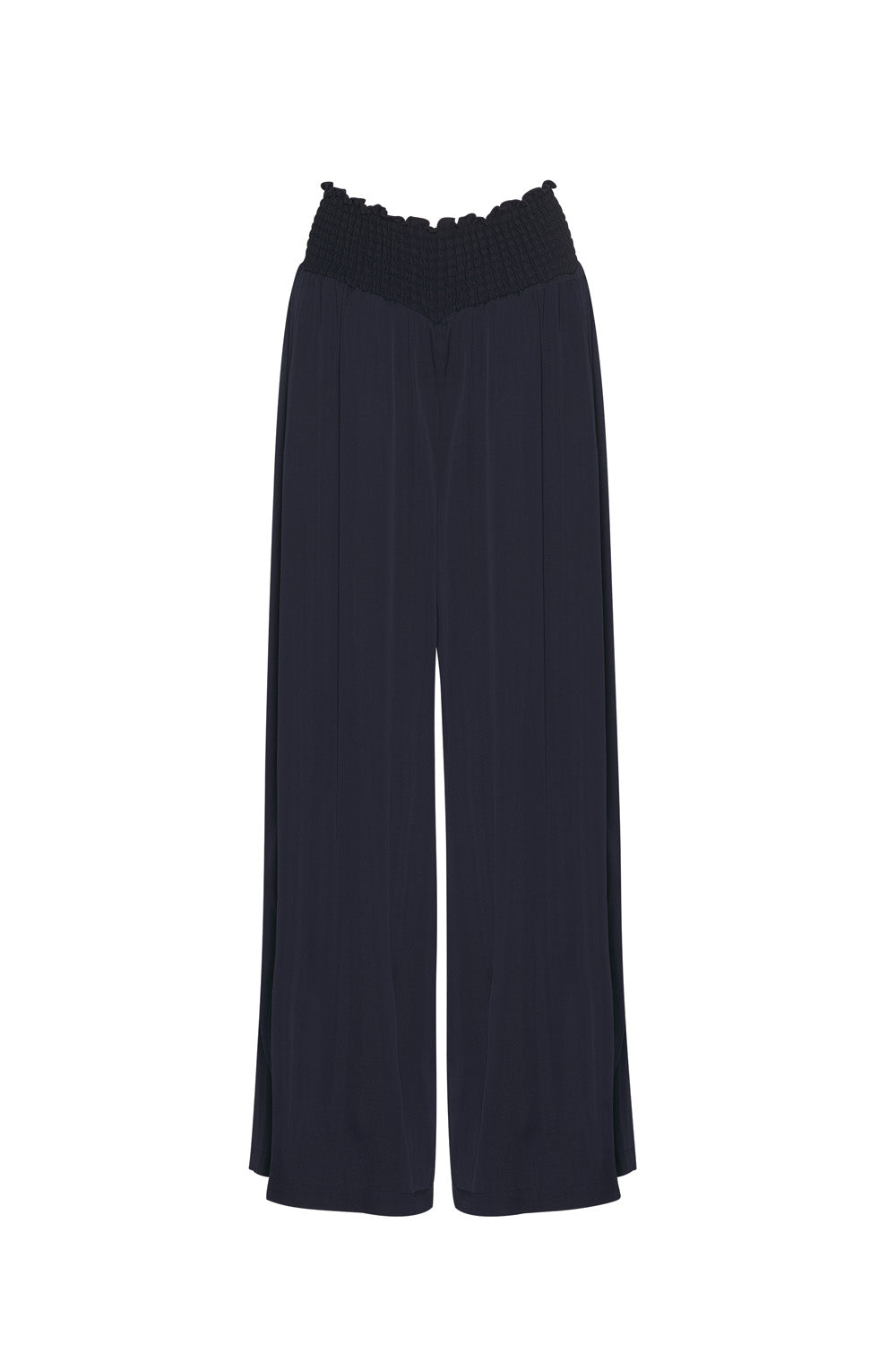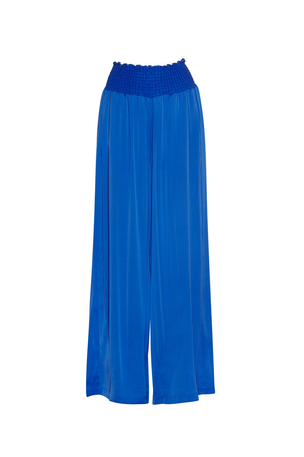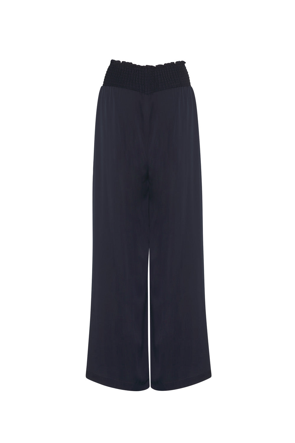 Luxe stretch silk satin wide leg palazzo pant with a shirred waistband and forward side seams for a flattering fit. Functional pockets