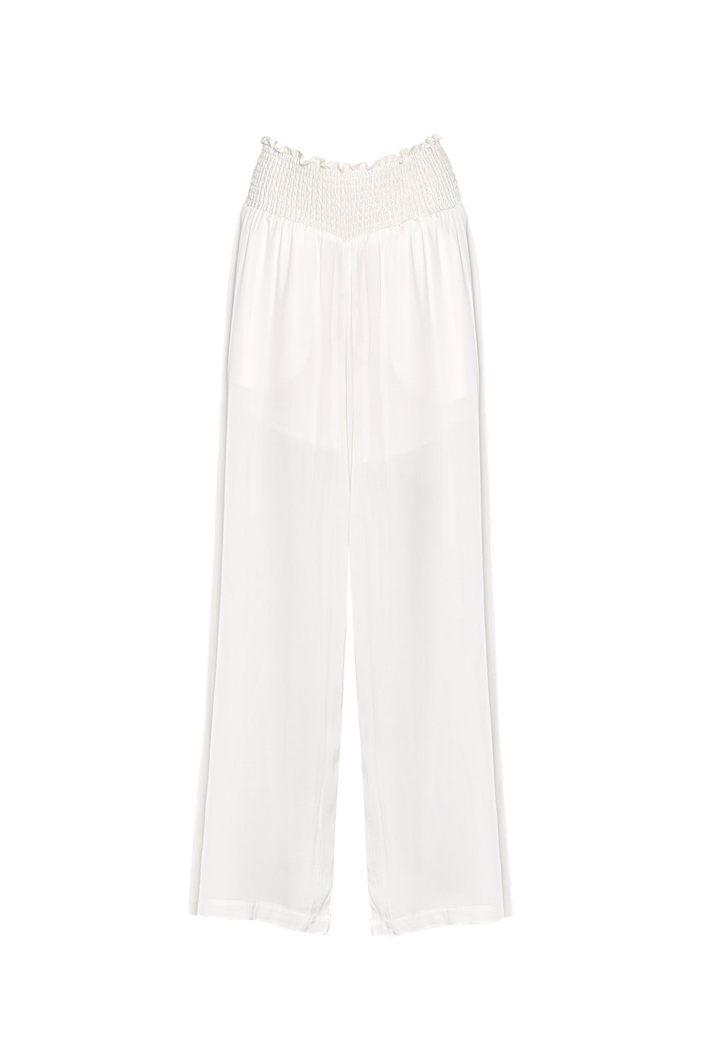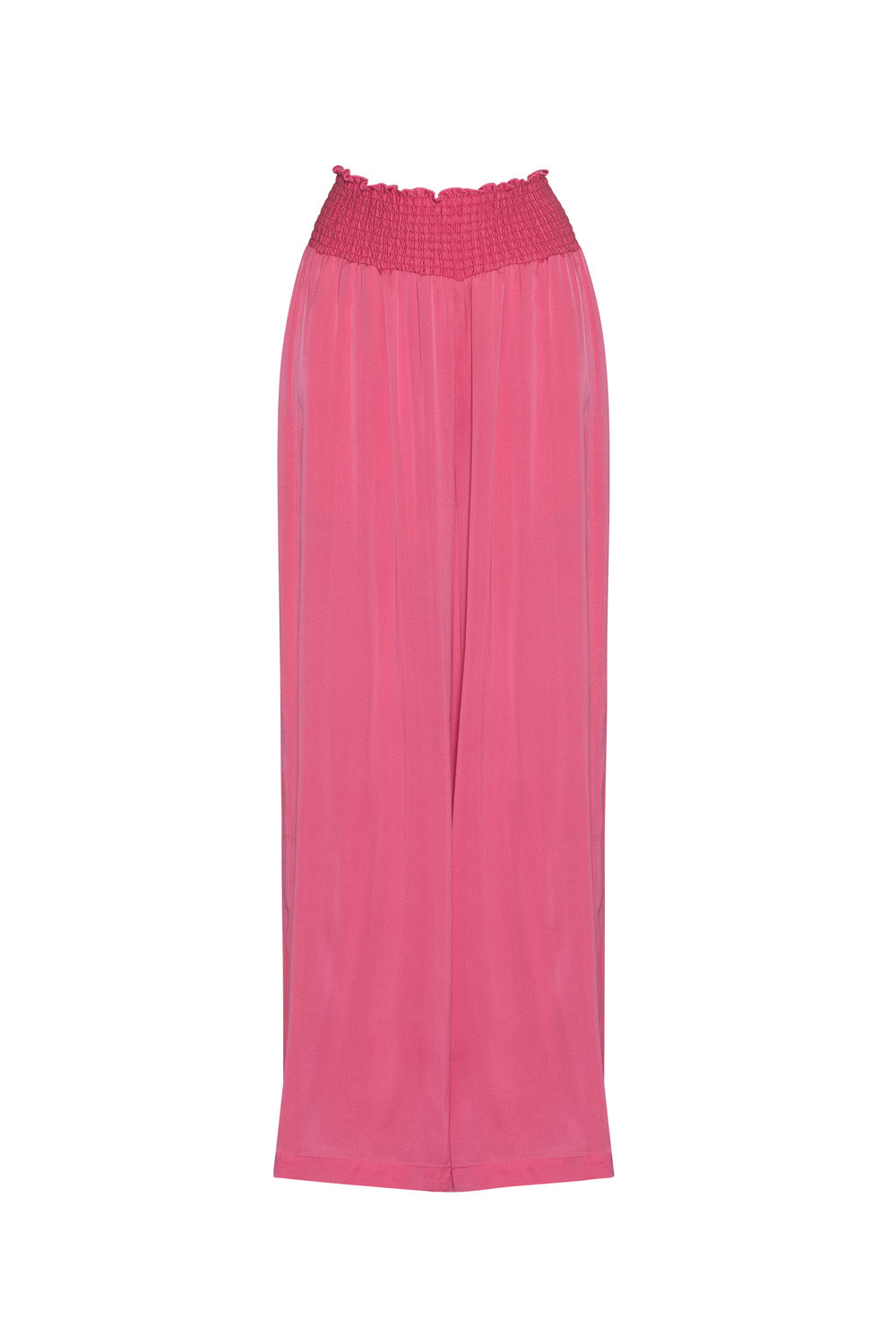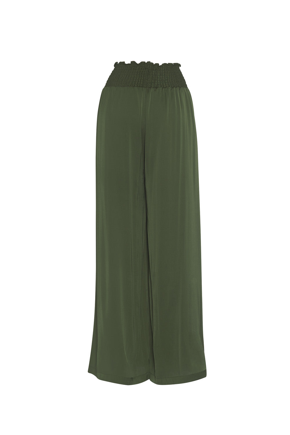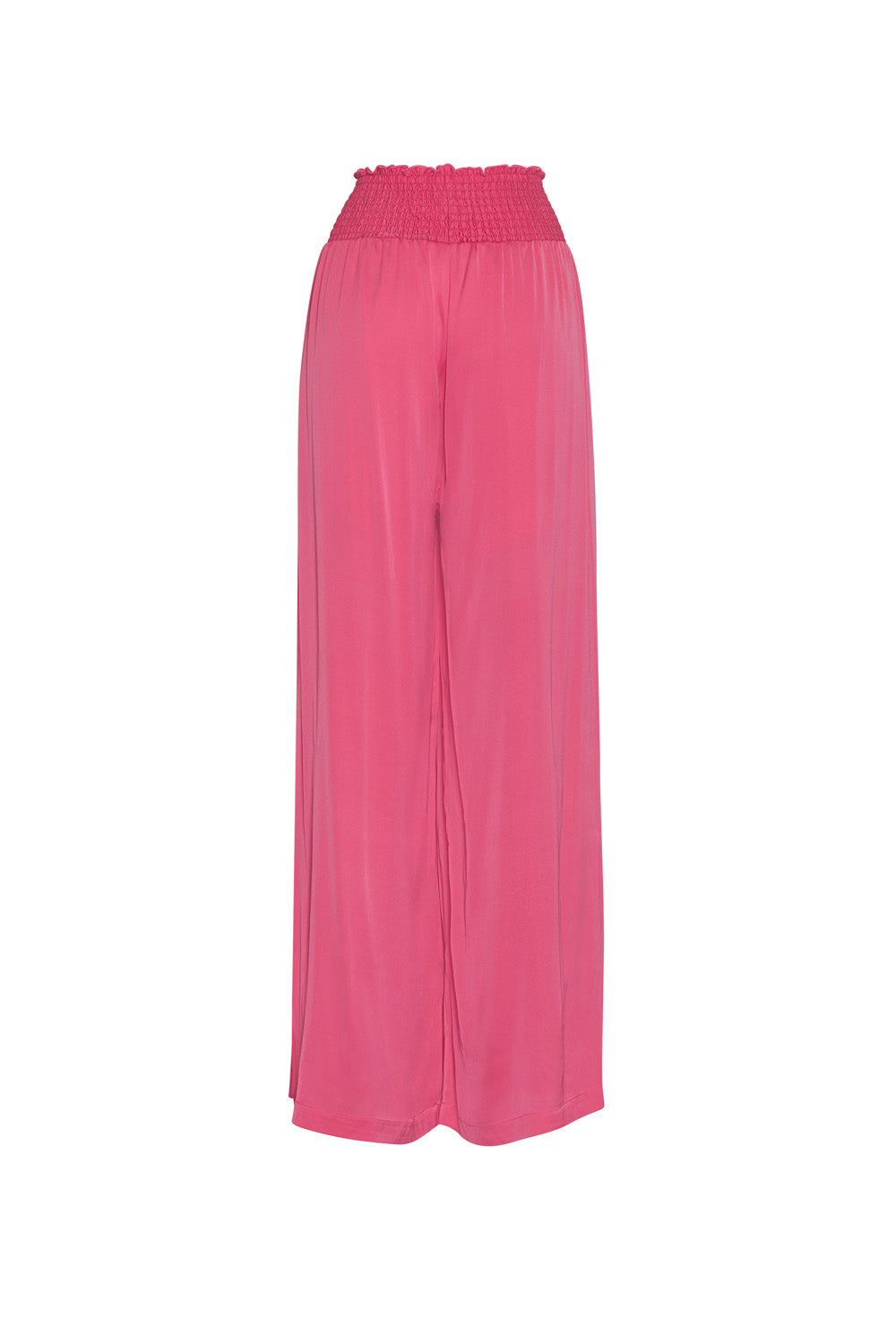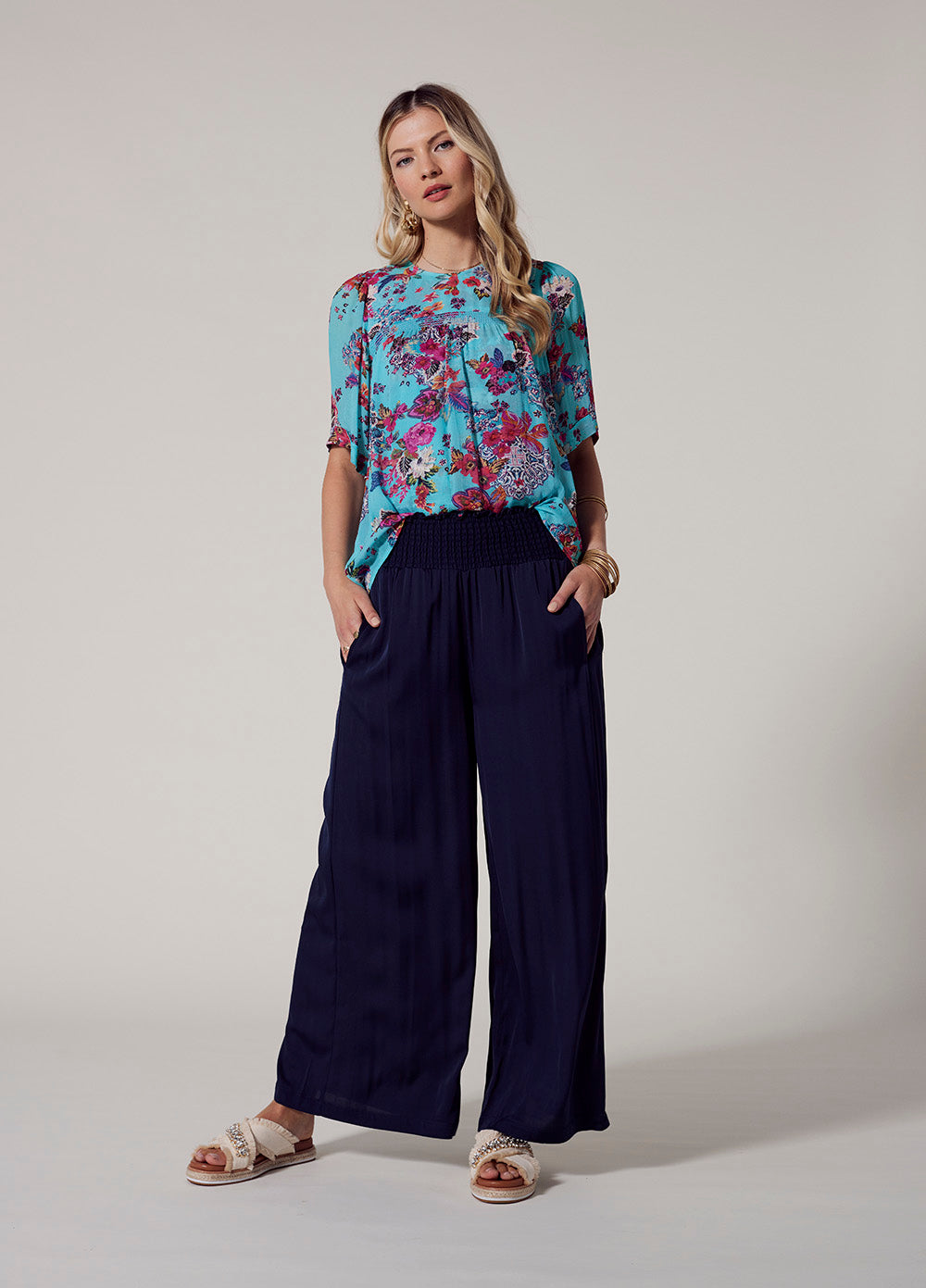 Luxe stretch silk satin wide leg palazzo pant with a shirred waistband and forward side seams for a flattering fit. Functional pockets