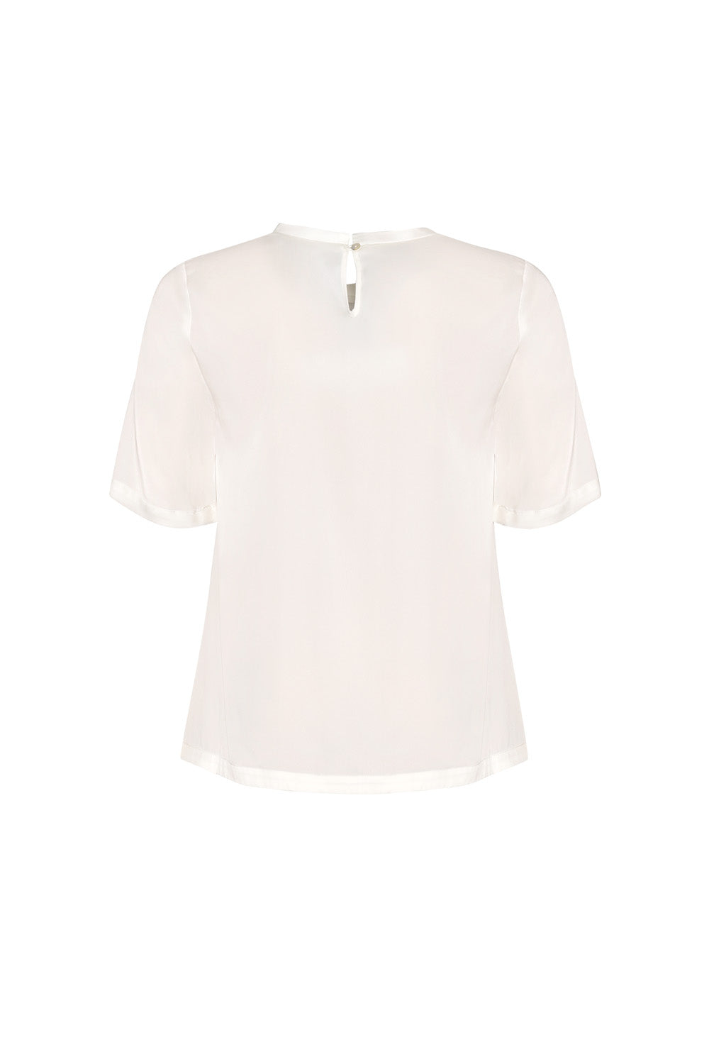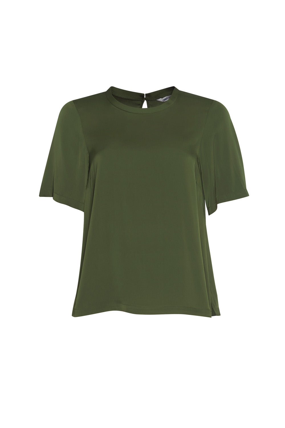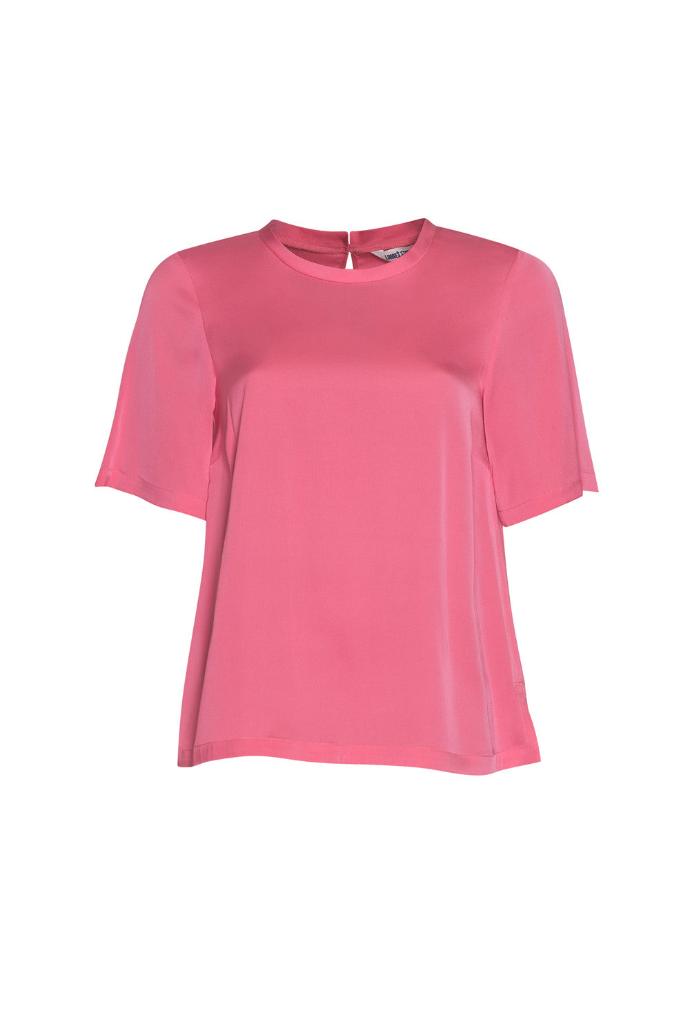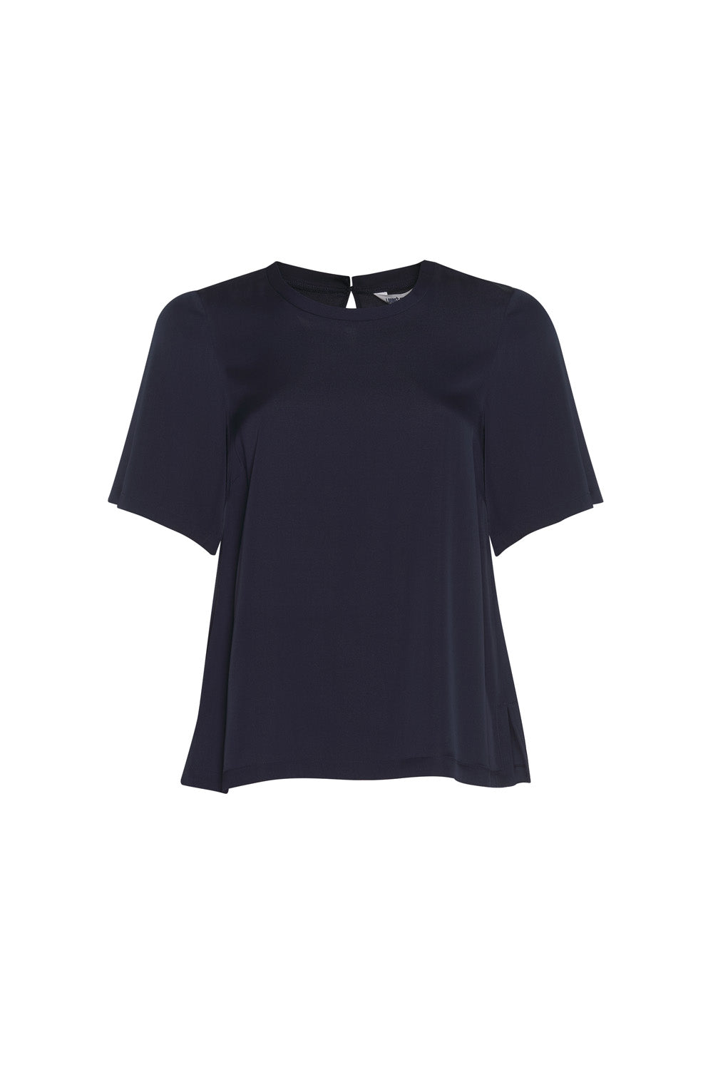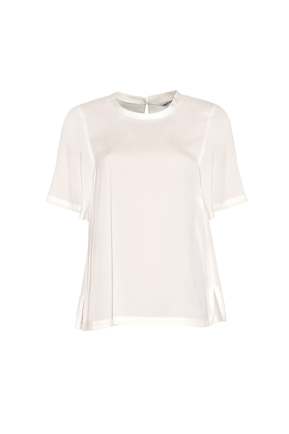 Luxe stretch silk satin tee with a round neckband and square hem with side splits.