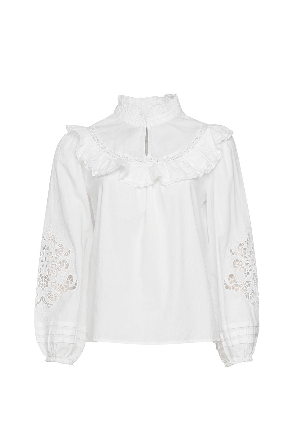 High neck blouse featuring a ruffle rounded neckline, with broderie detail on the sleeves, and an elastic cuff.
