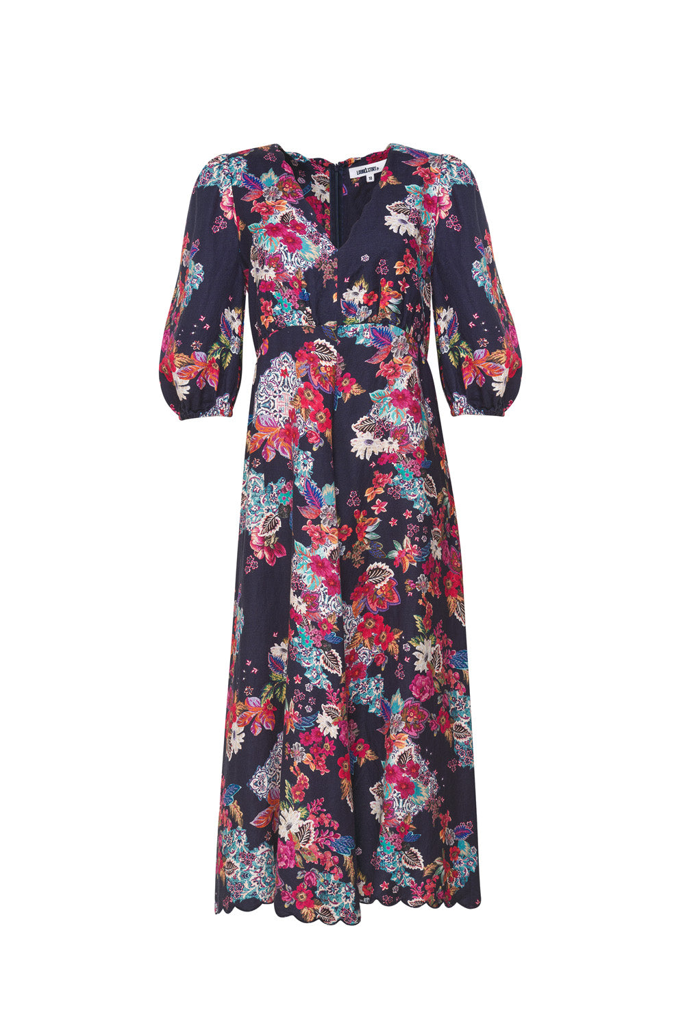 Printed midi dress with a scalloped V-neckline and hem, with blouson sleeves elasticated at the cuff. Featuring a concealed zip and elasticated at the back waist for a flattering fit.