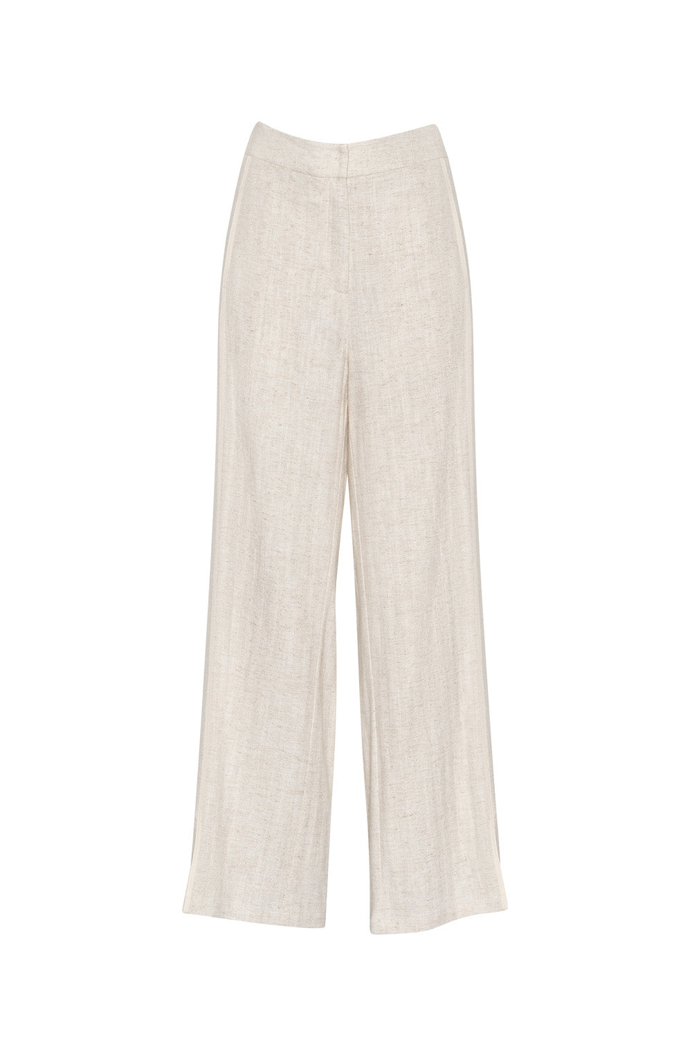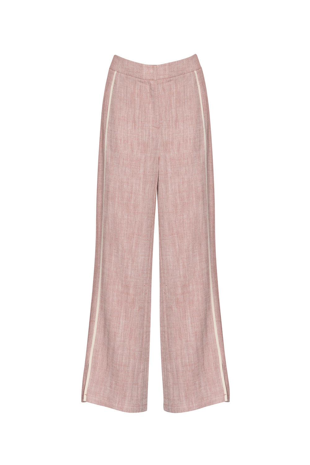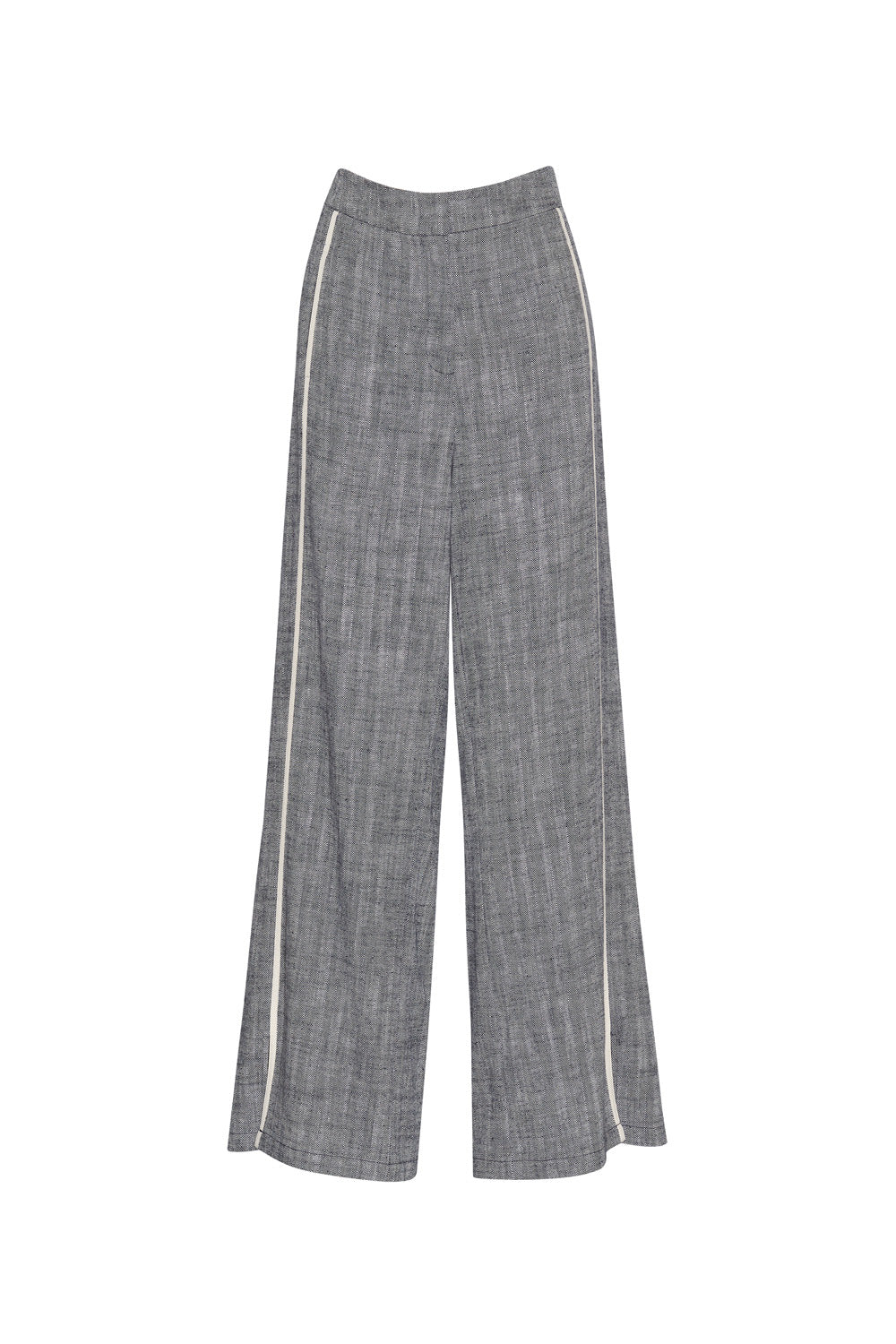 Mid-rise wide-leg pant with herringbone tape outlining the front leg seam, with hidden front pockets and cuff split.