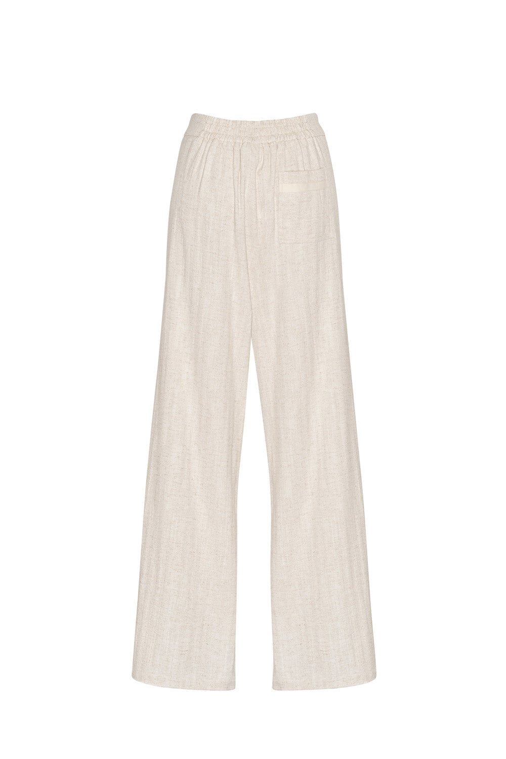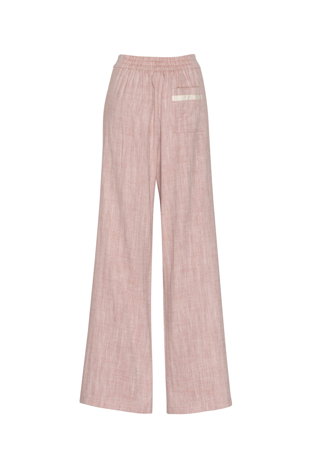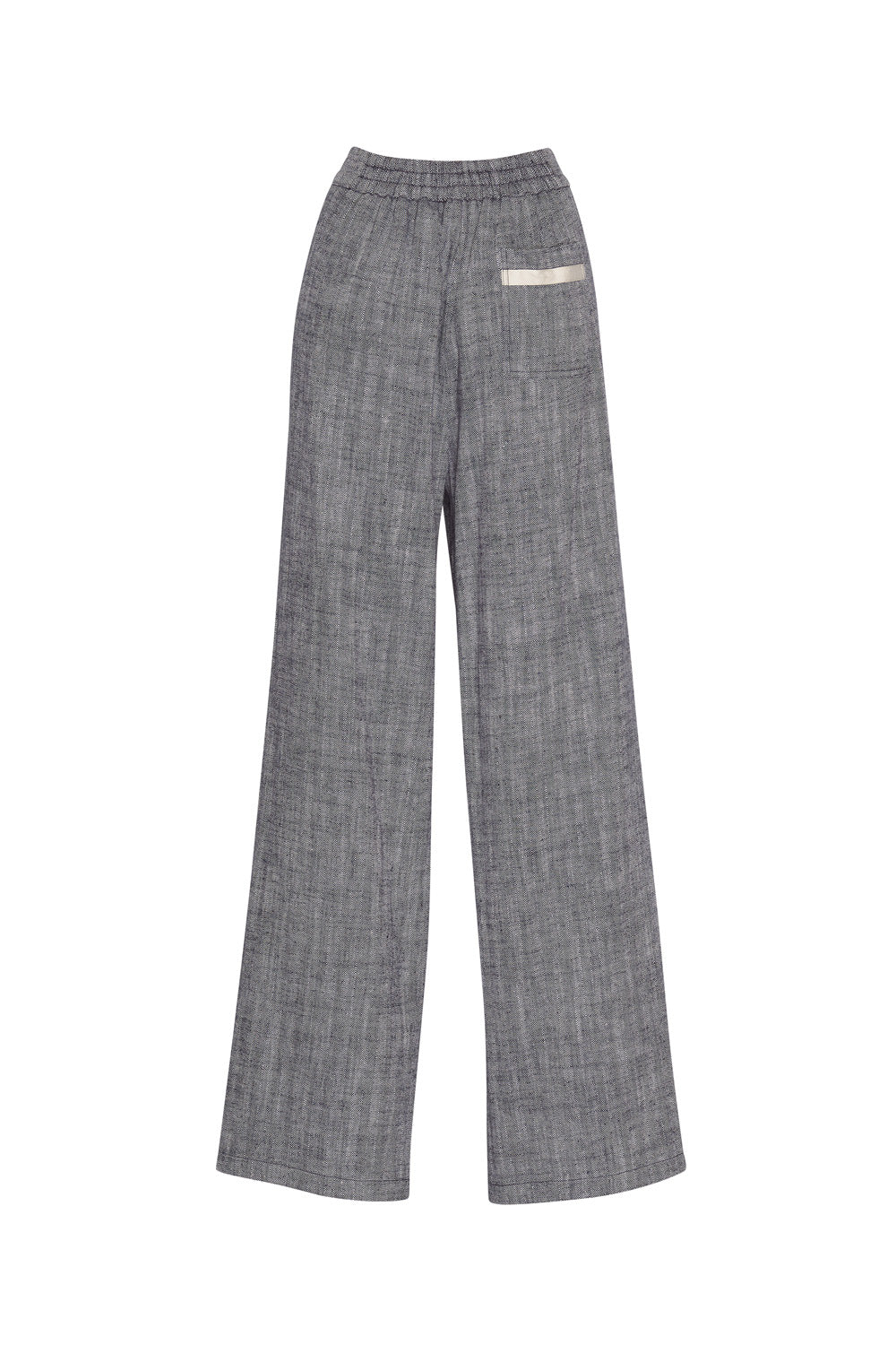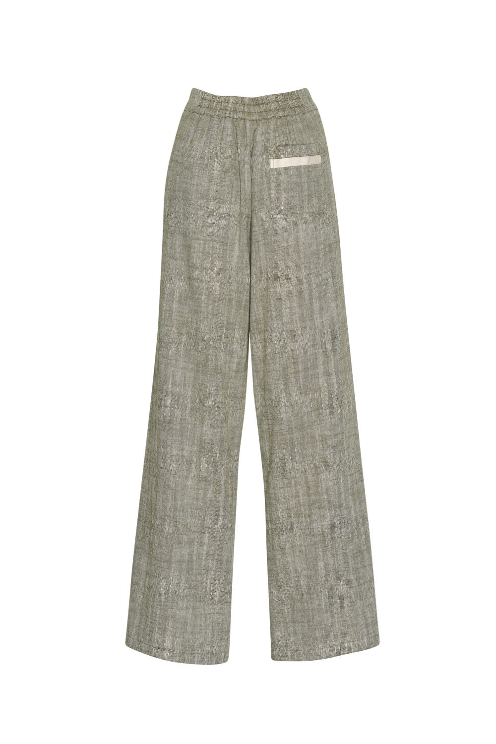 Mid-rise wide-leg pant with herringbone tape outlining the front leg seam, with hidden front pockets and cuff split.