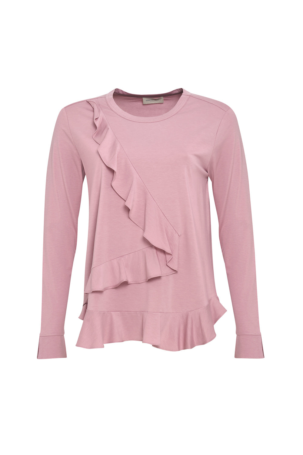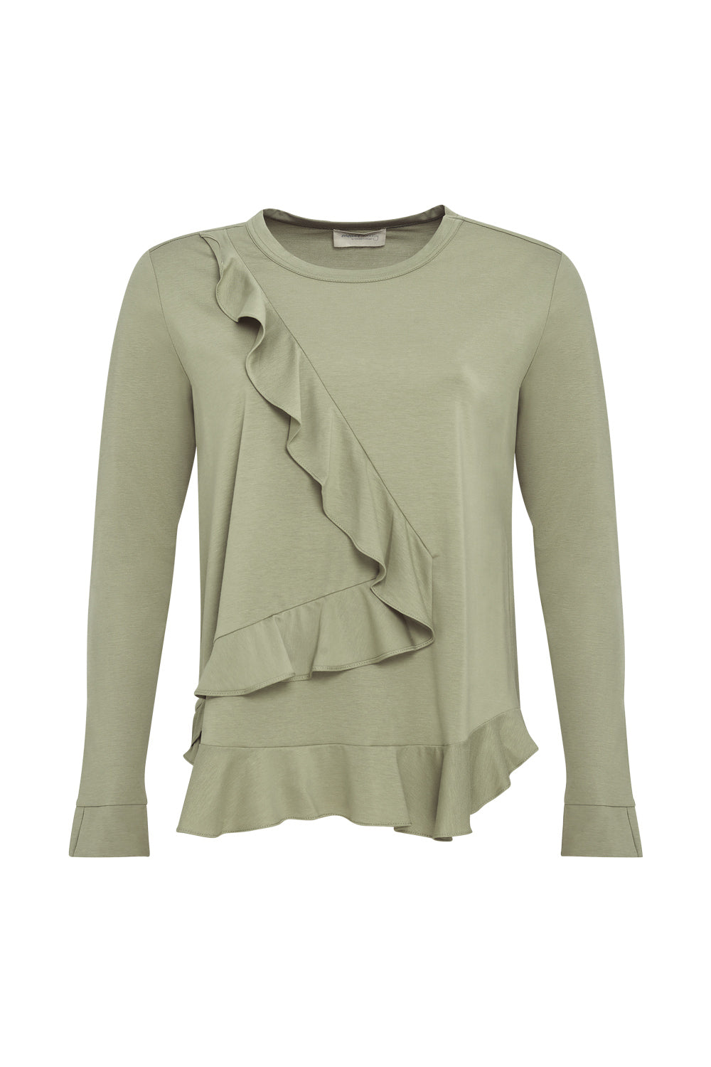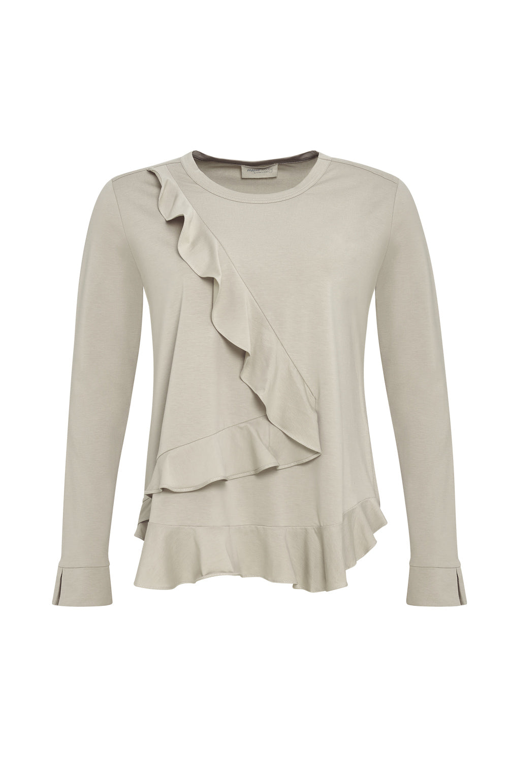Light weight cotton top with a crew neckline with a split cuff. Featuring flounce detailing across the body and along the front hem.