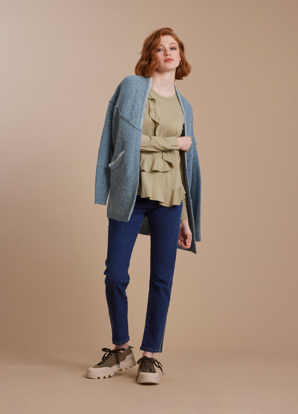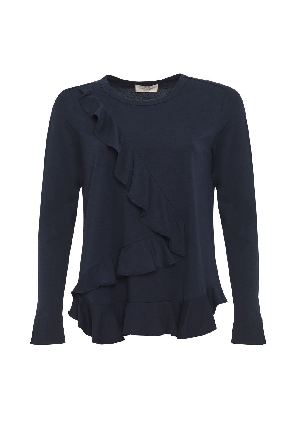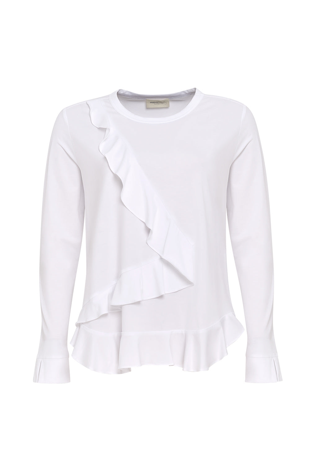 Light weight cotton top with a crew neckline with a split cuff. Featuring flounce detailing across the body and along the front hem.