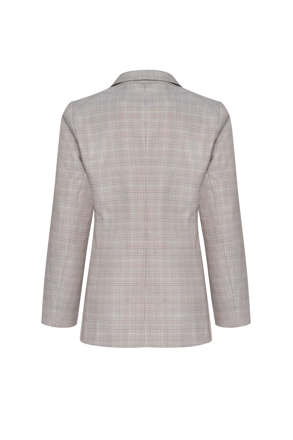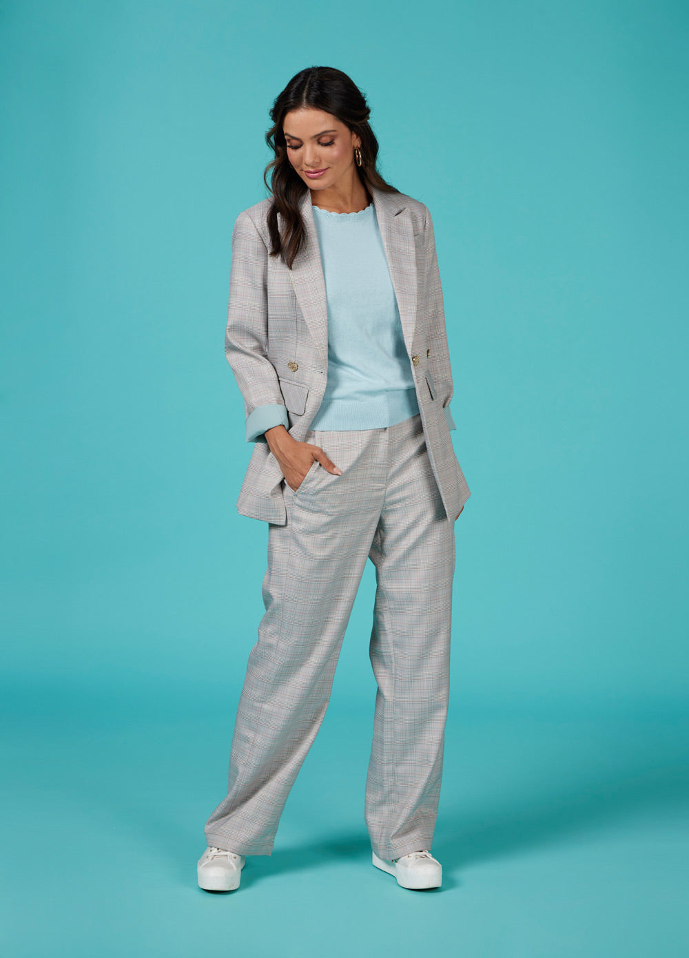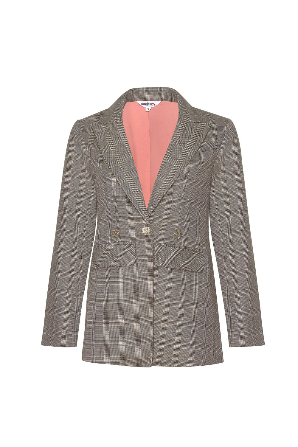 Longline blazer with a lapel collar and double breasted button design at front closure. Featuring forward side seams with flattering splits and subtle metallic pick stitching.