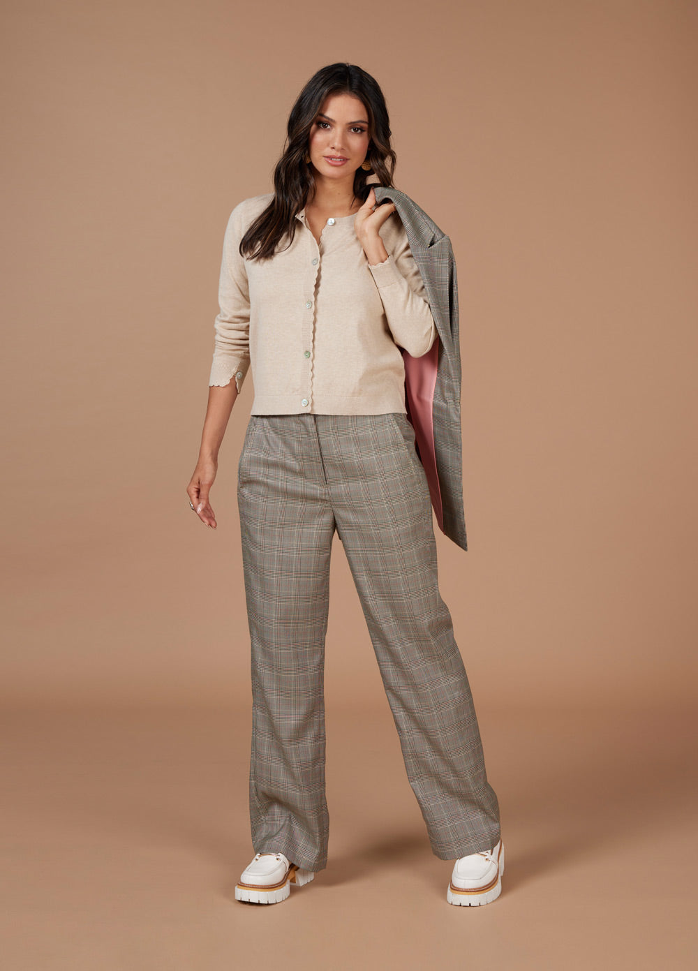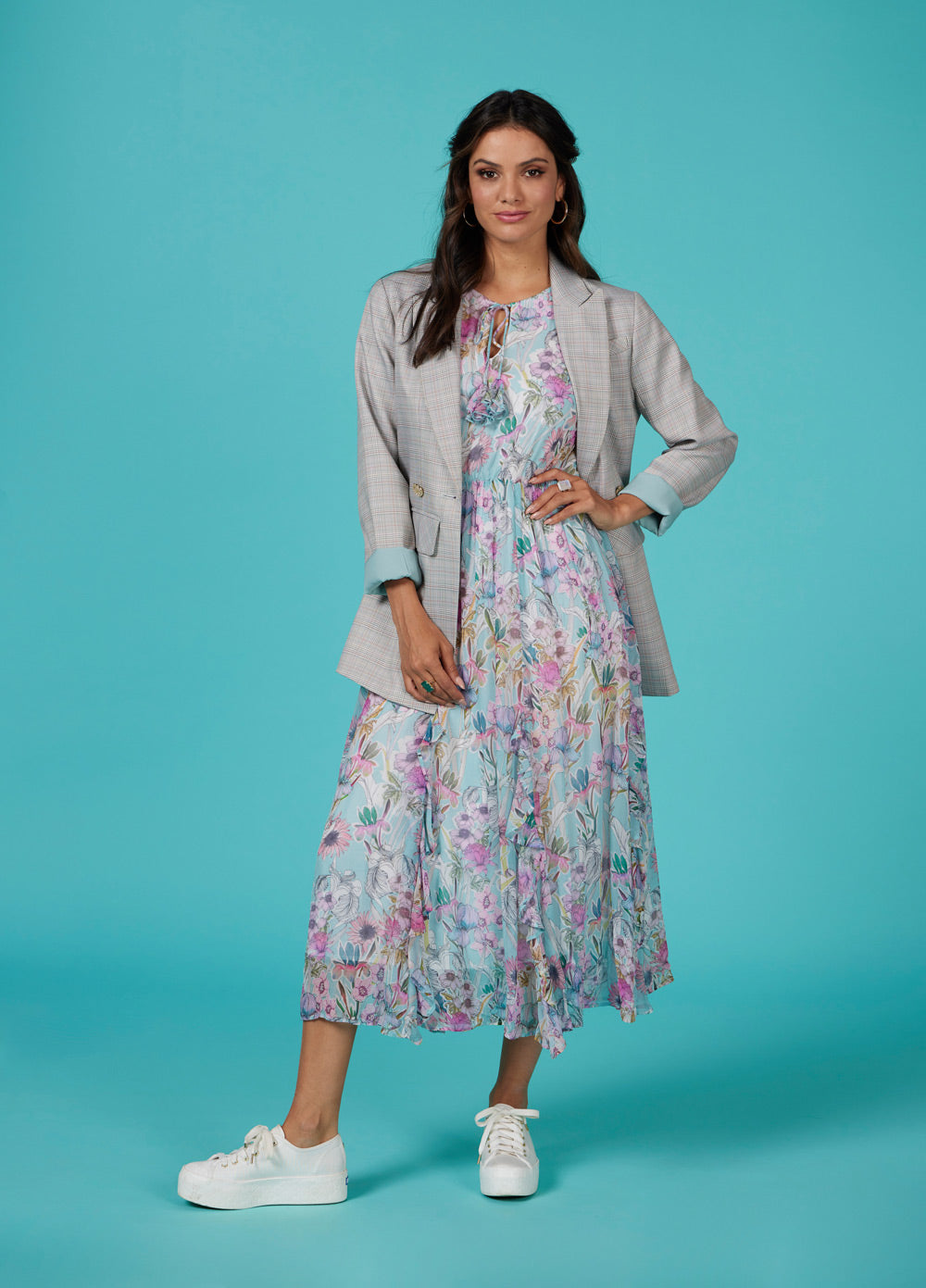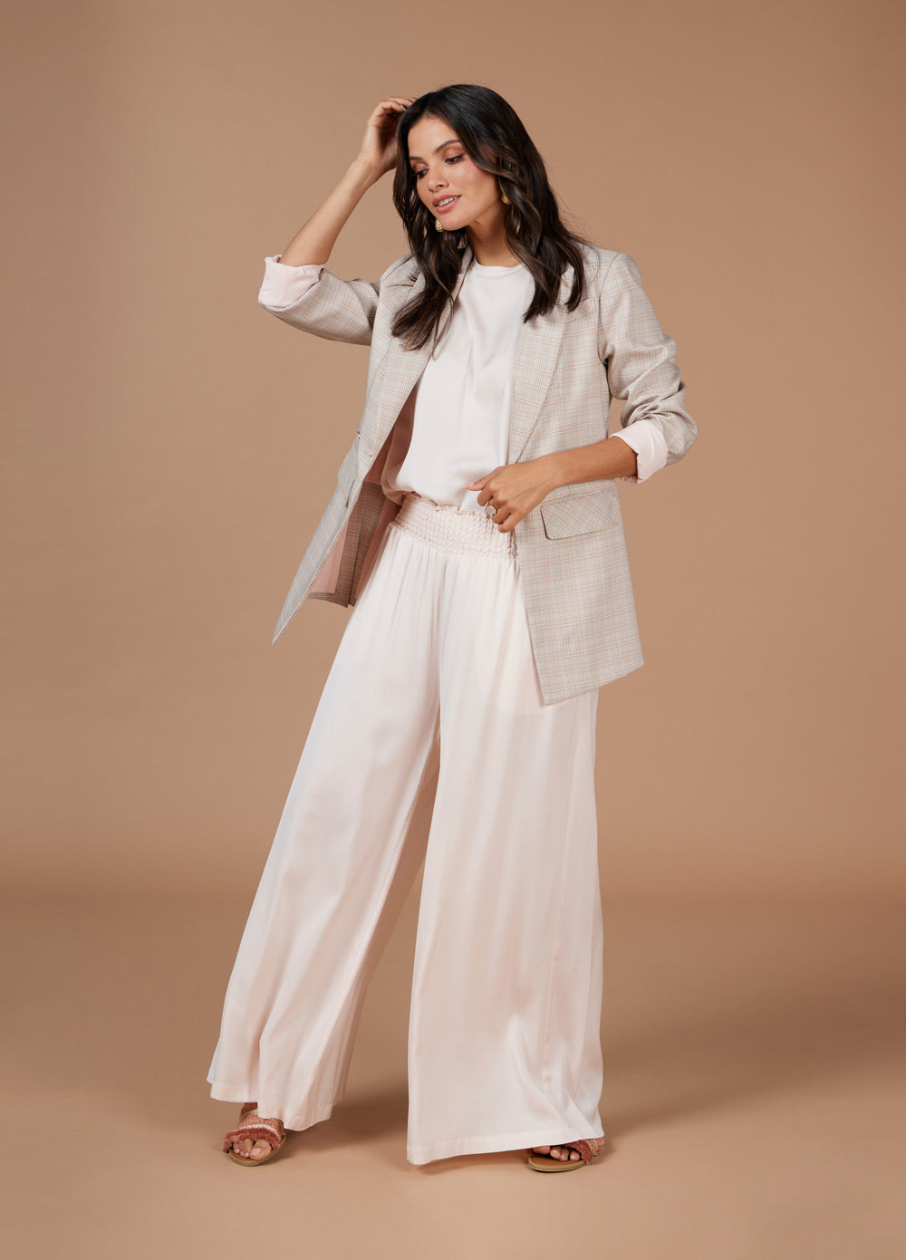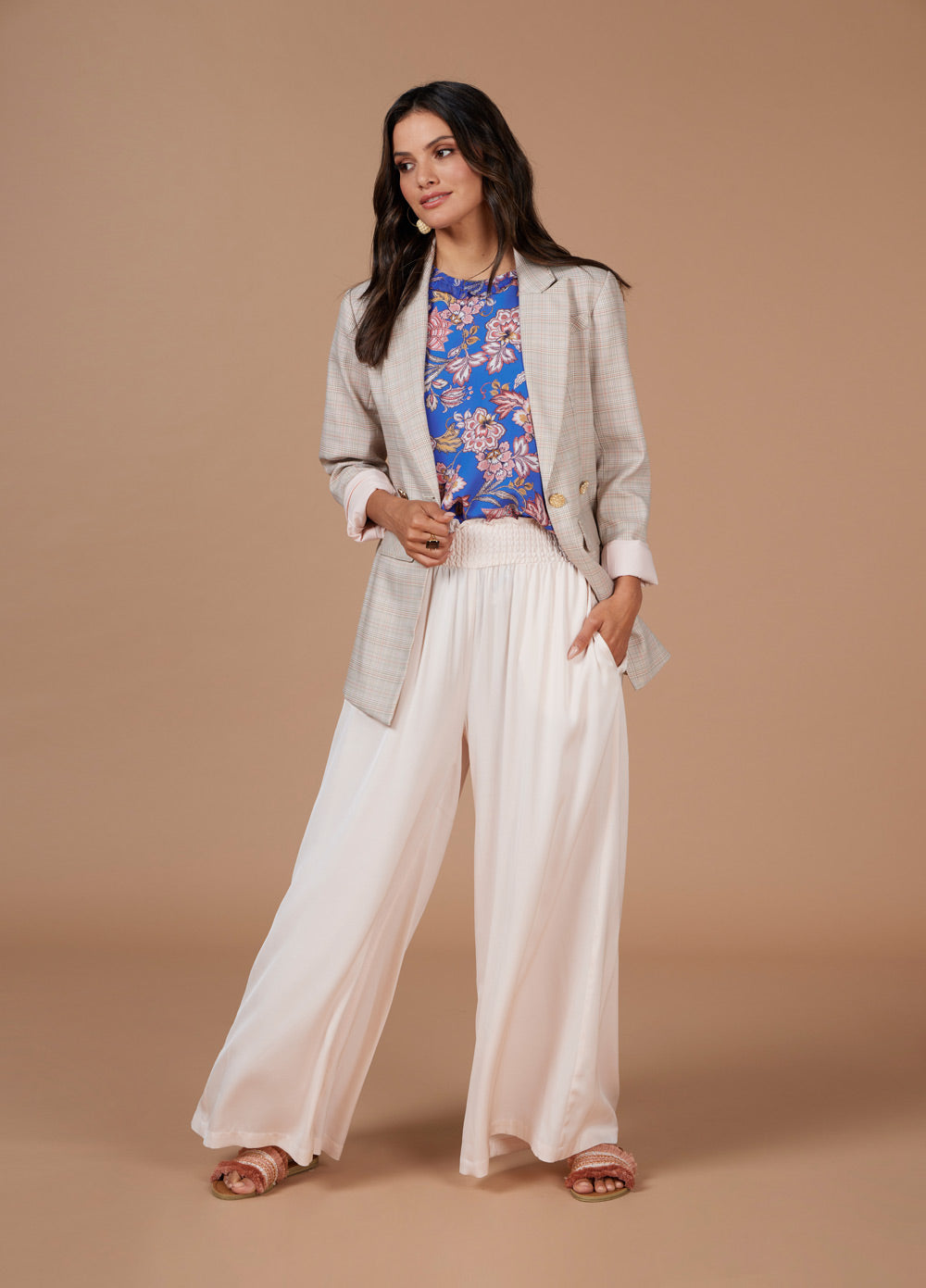 Longline blazer with a lapel collar and double breasted button design at front closure. Featuring forward side seams with flattering splits and subtle metallic pick stitching.