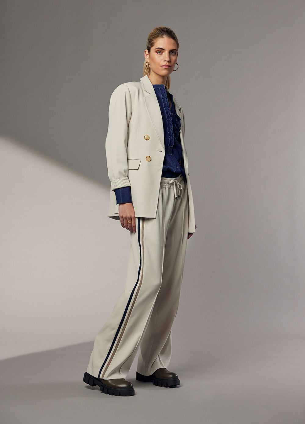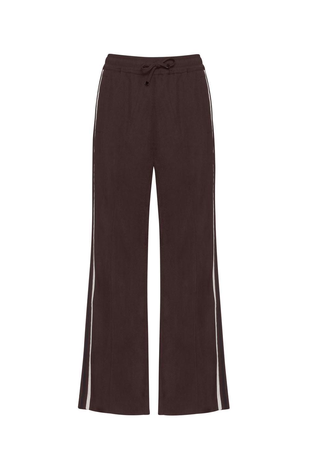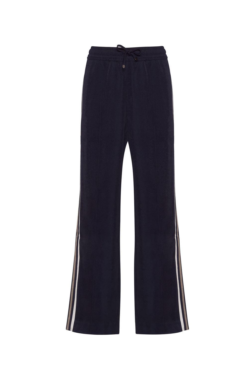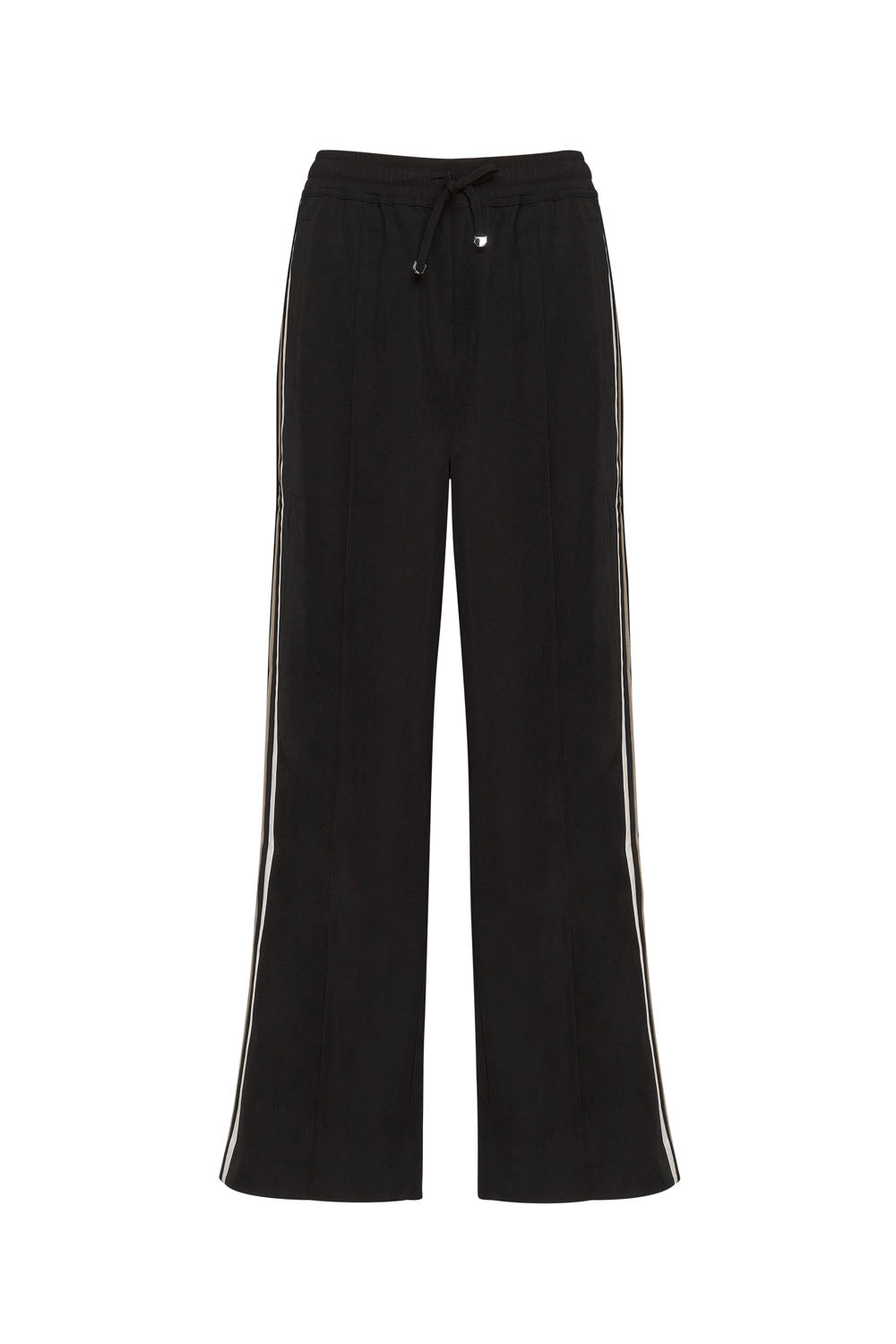 Relaxed fit straight-leg pant with an elasticated, drawstring waistband, featuring contrast striped side panels.