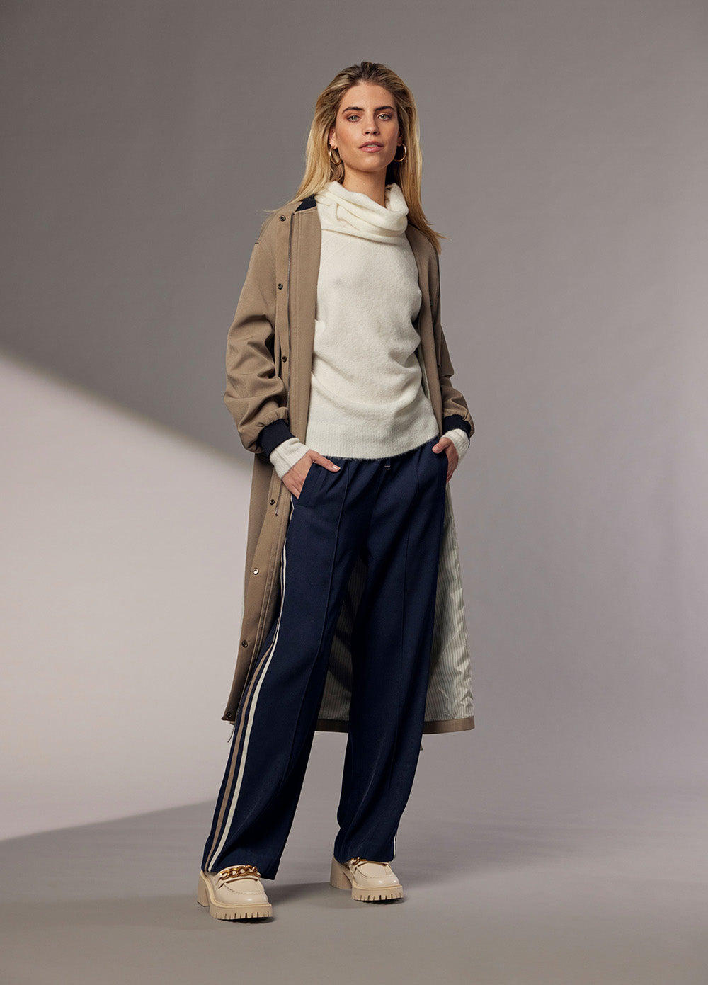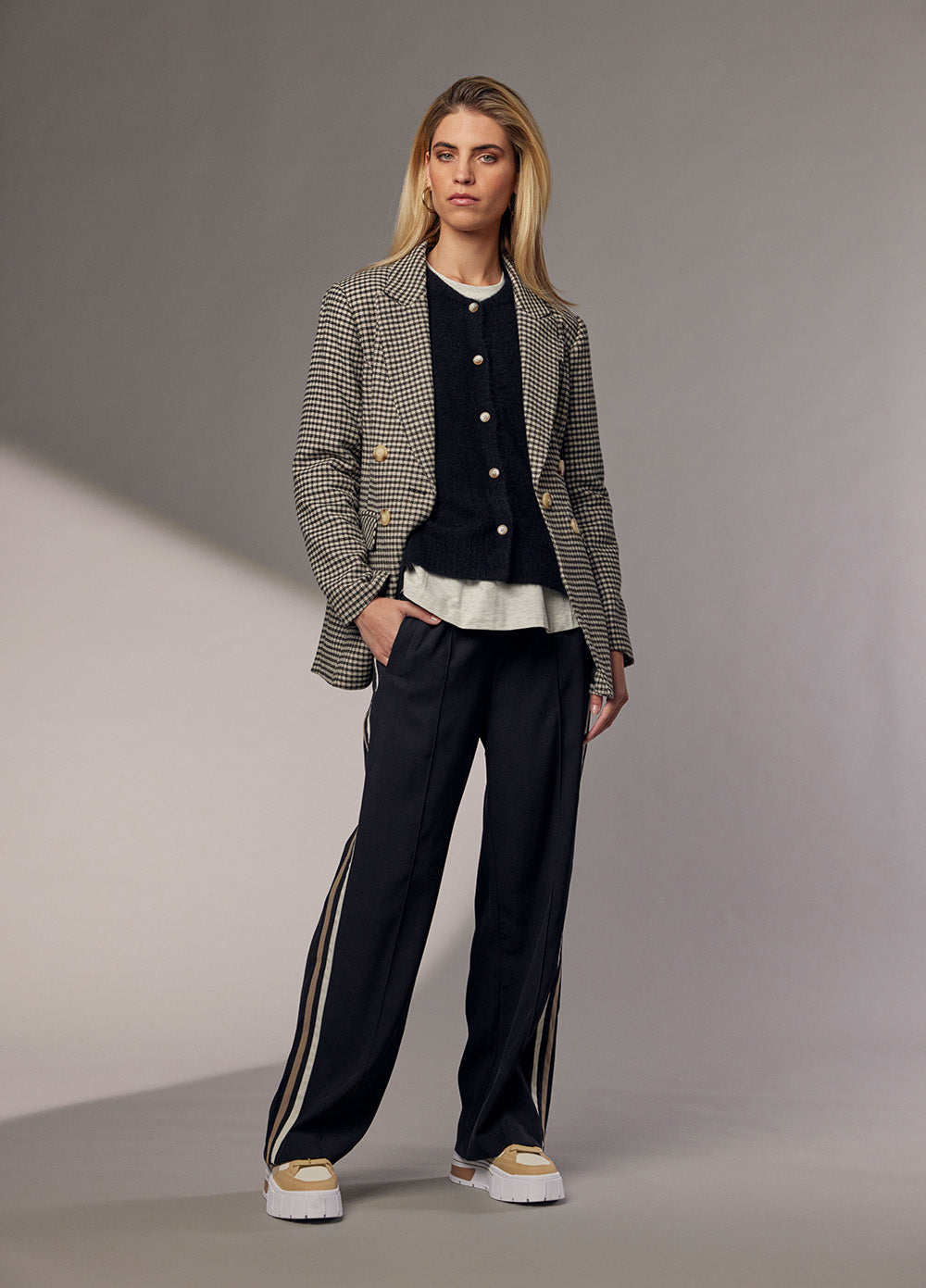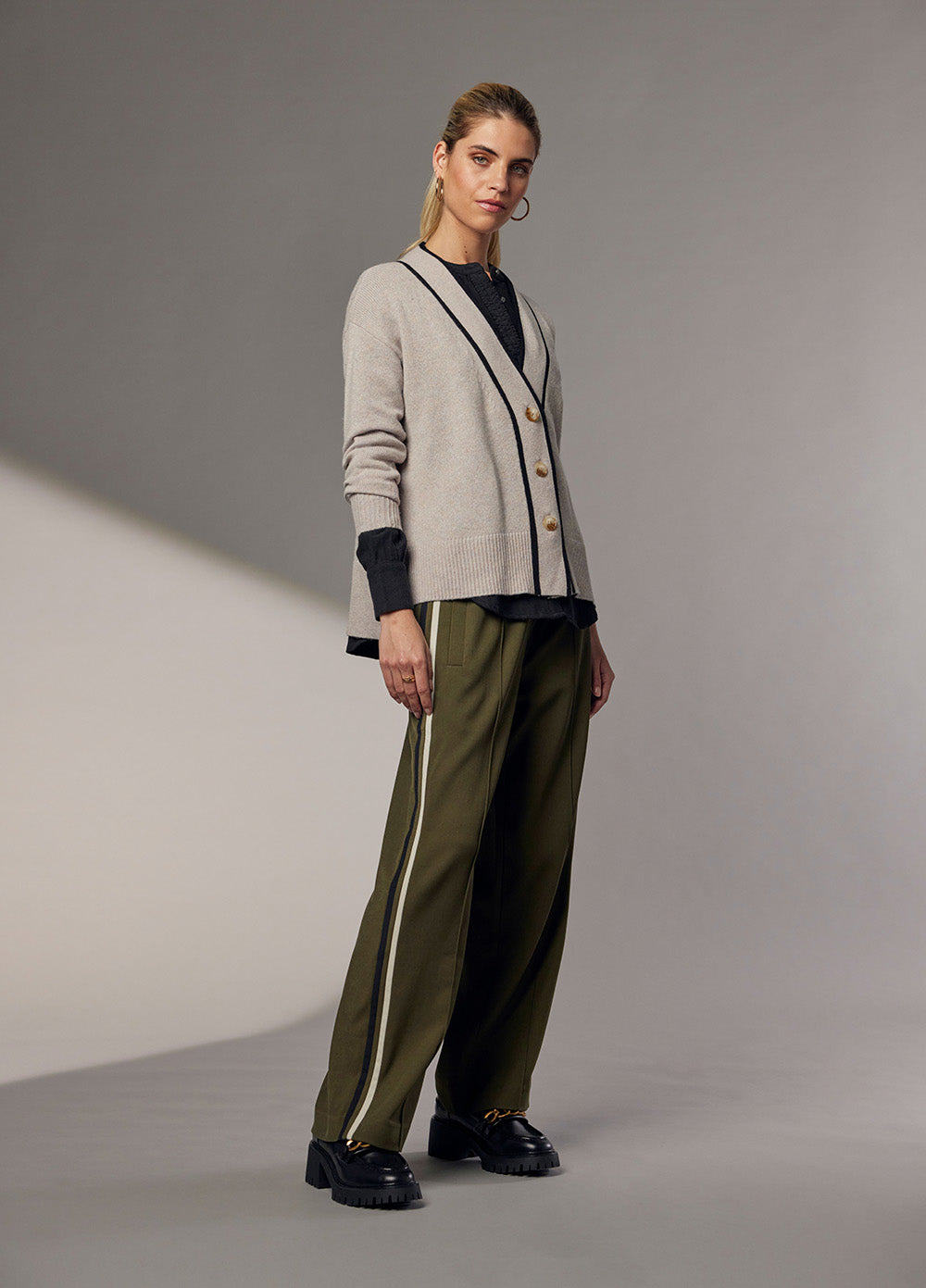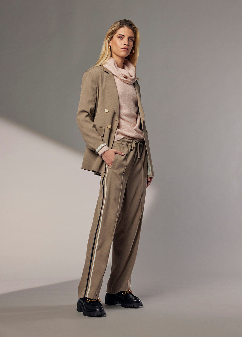Relaxed fit straight-leg pant with an elasticated, drawstring waistband, featuring contrast striped side panels.