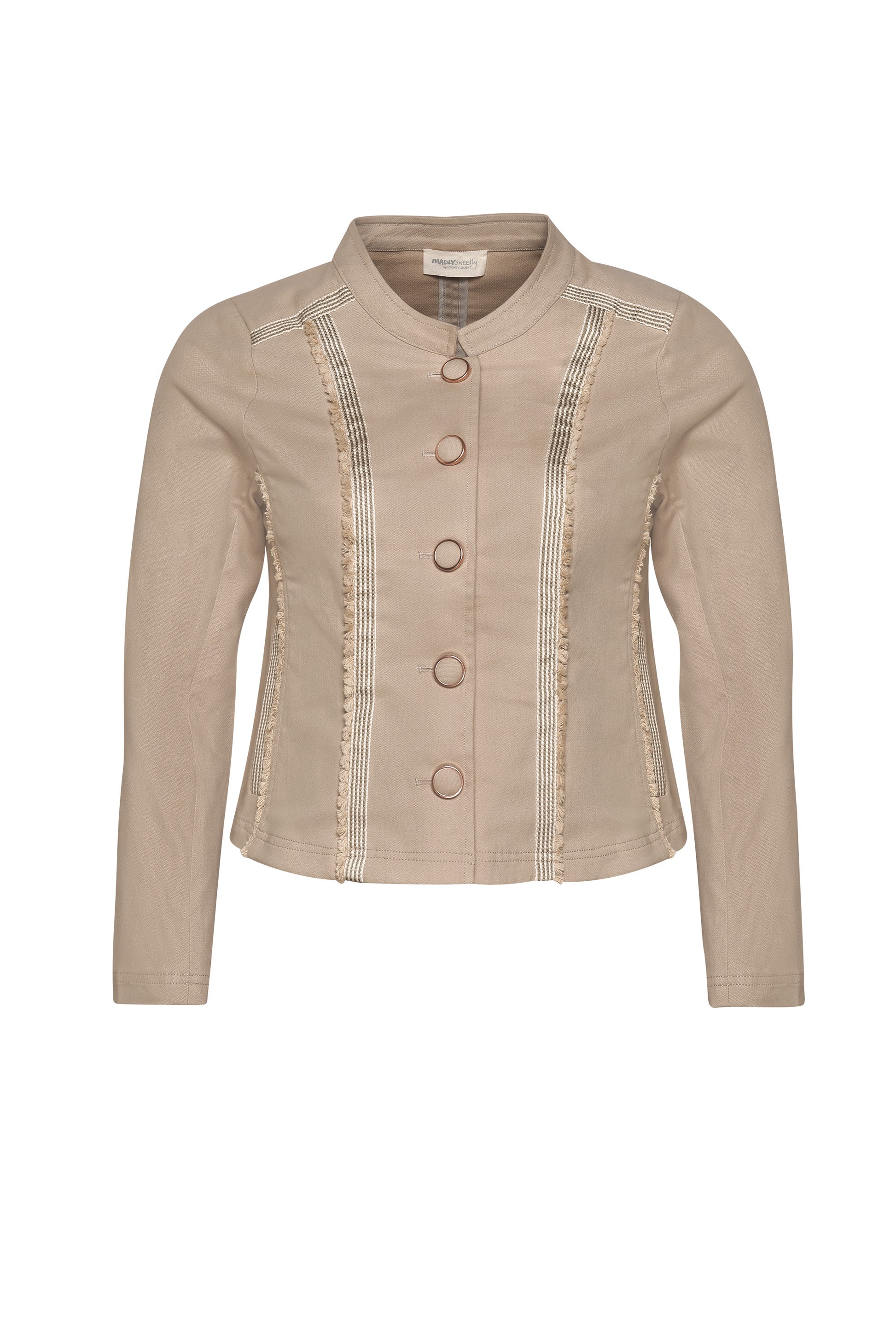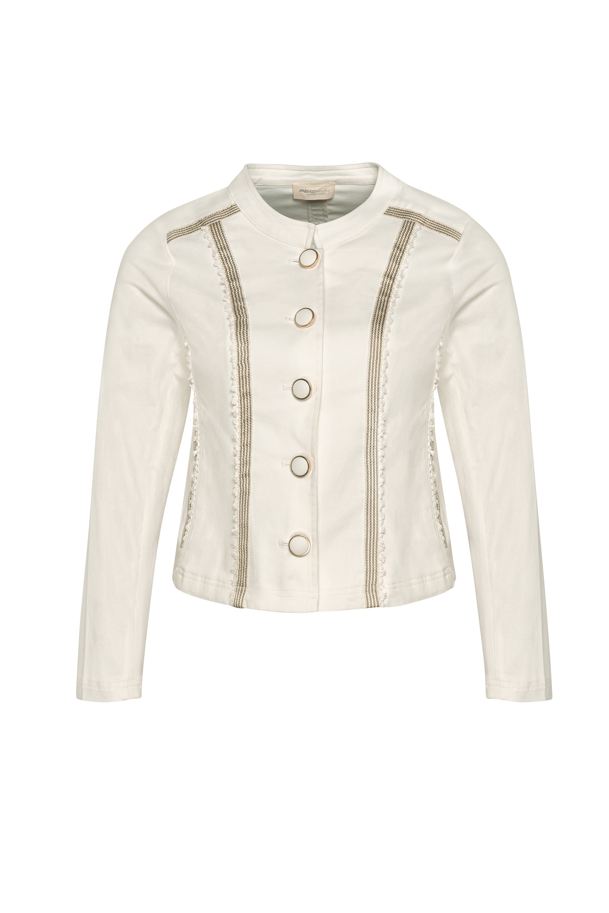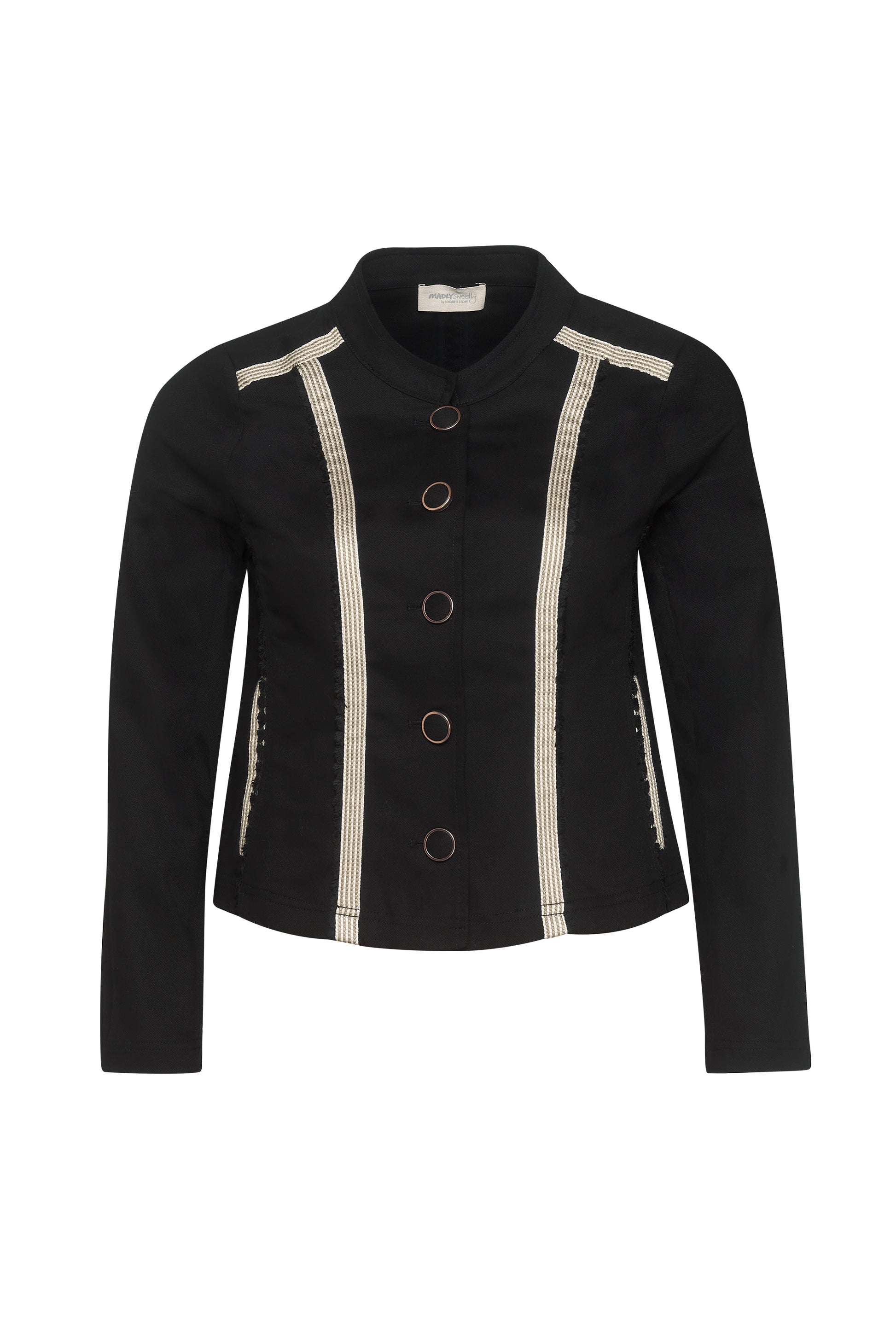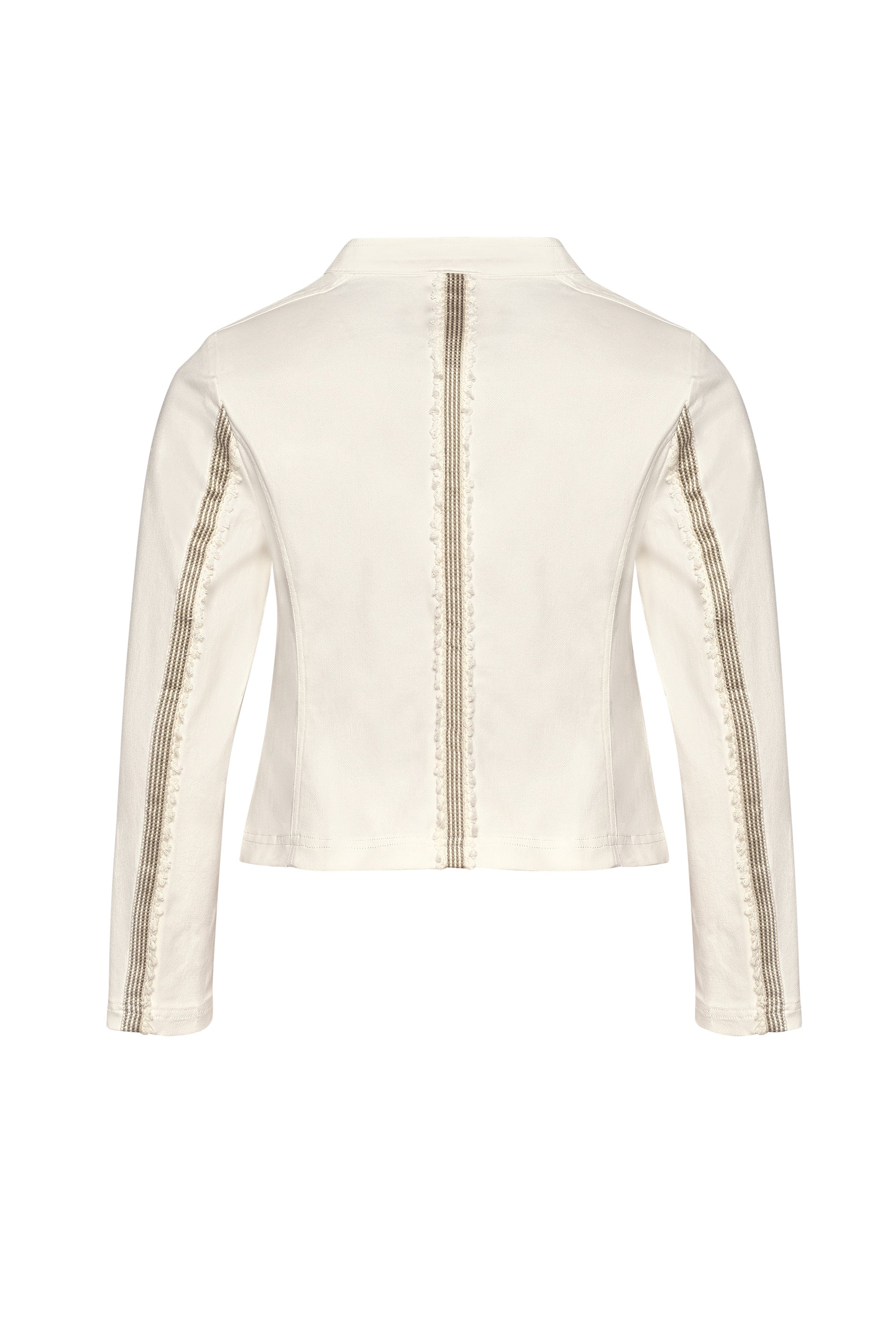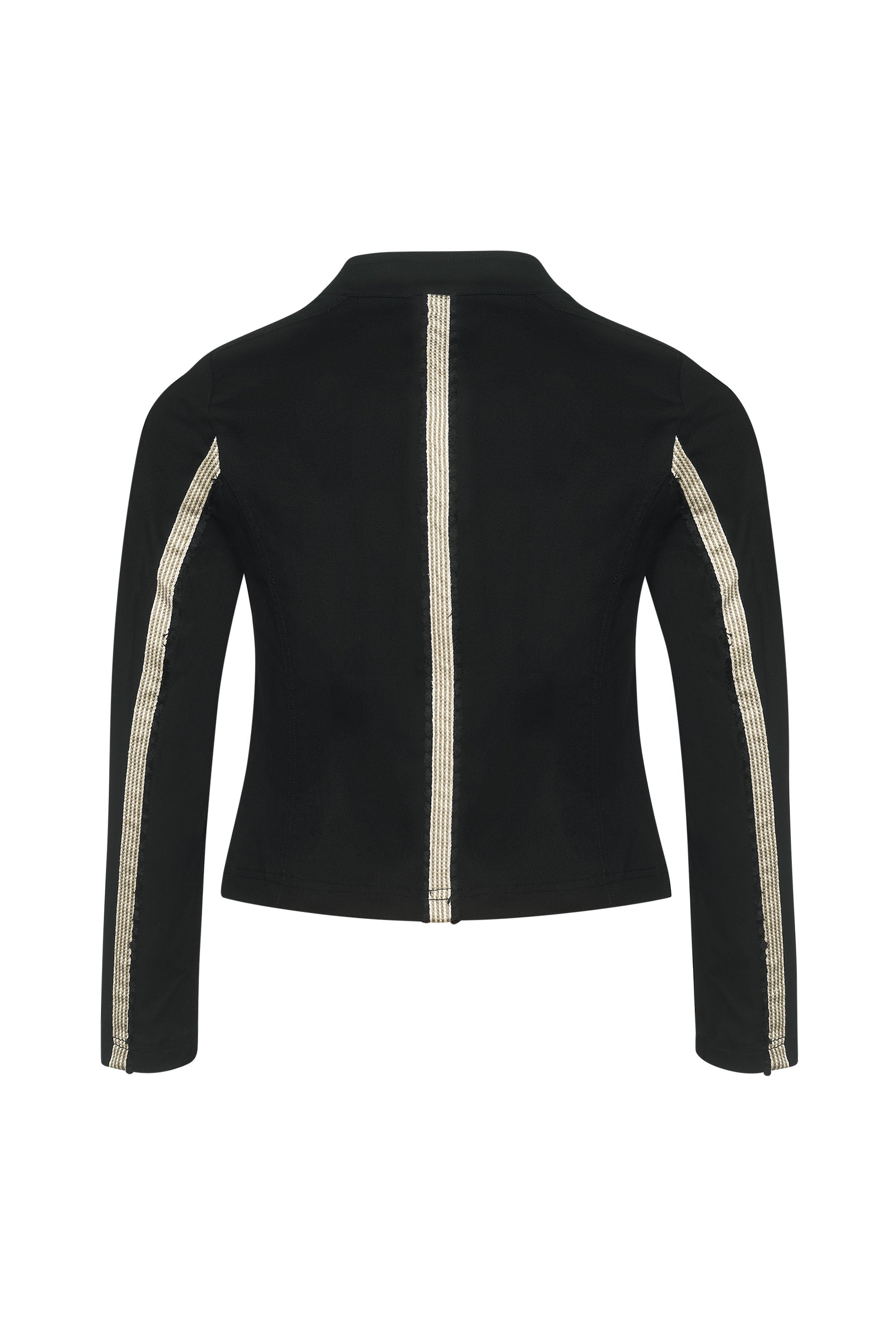 Form fitting paneled jacket in stretch cotton fabrication with white and ecru striped tape trim at forward shoulder, panel seam and pocket welt.