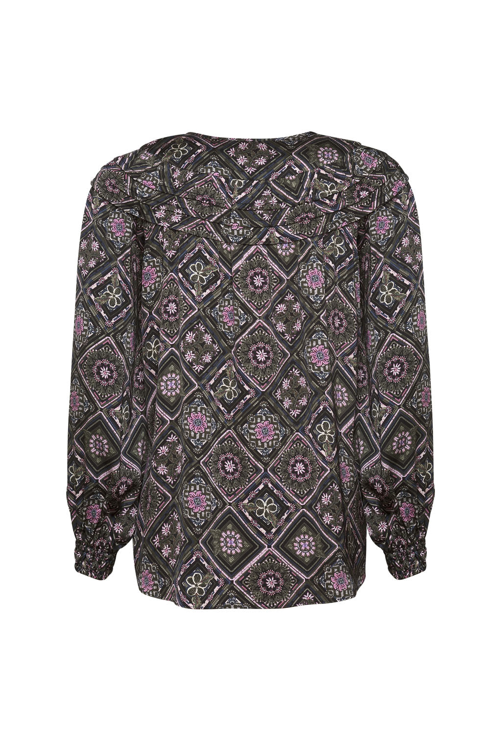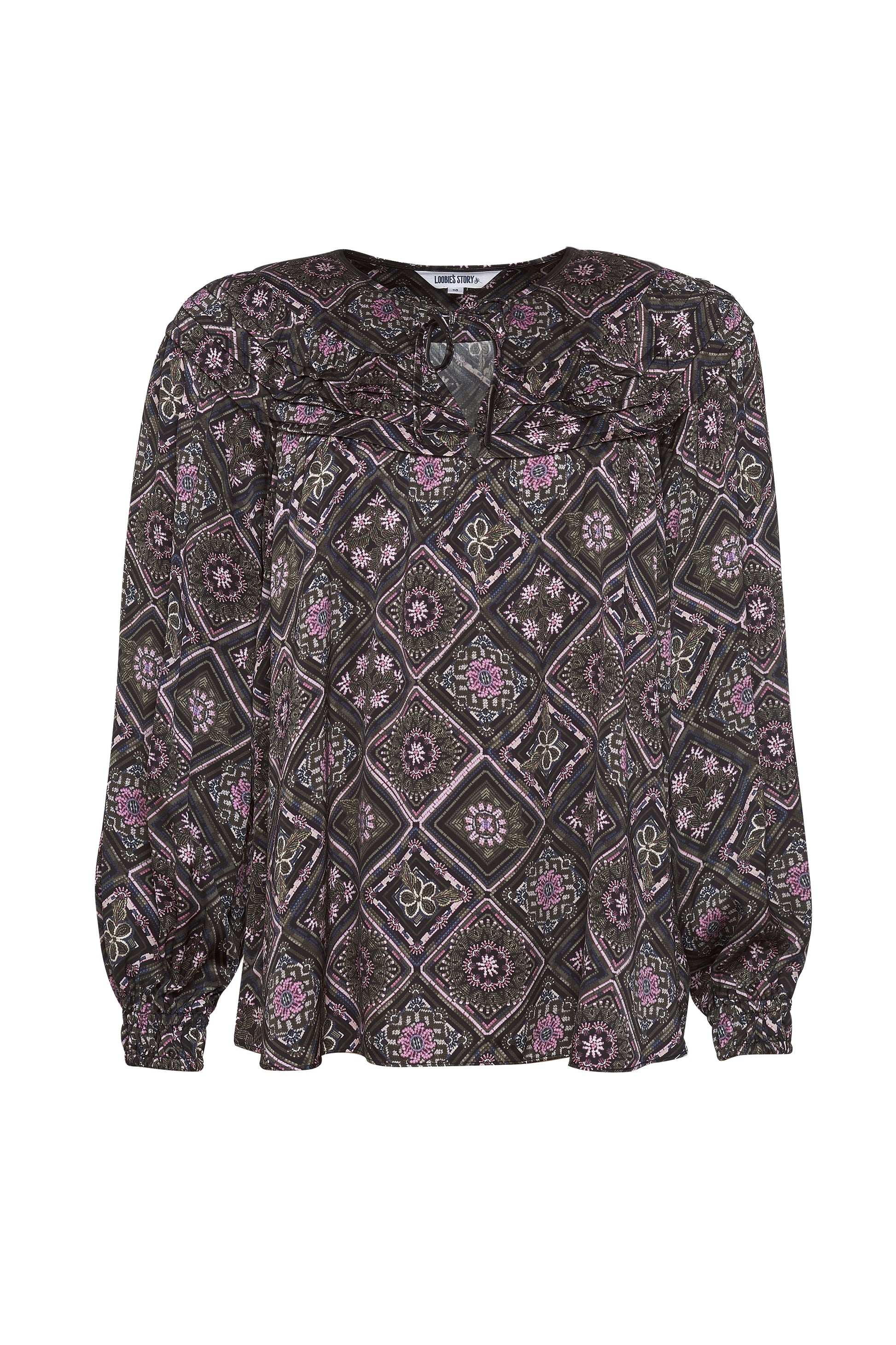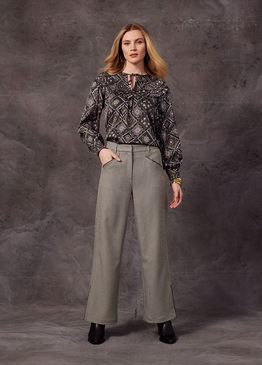 Relaxed fit blouse with a tie neckline, featuring sewn-in tucks and gathered detail, with elasticated cuffs.