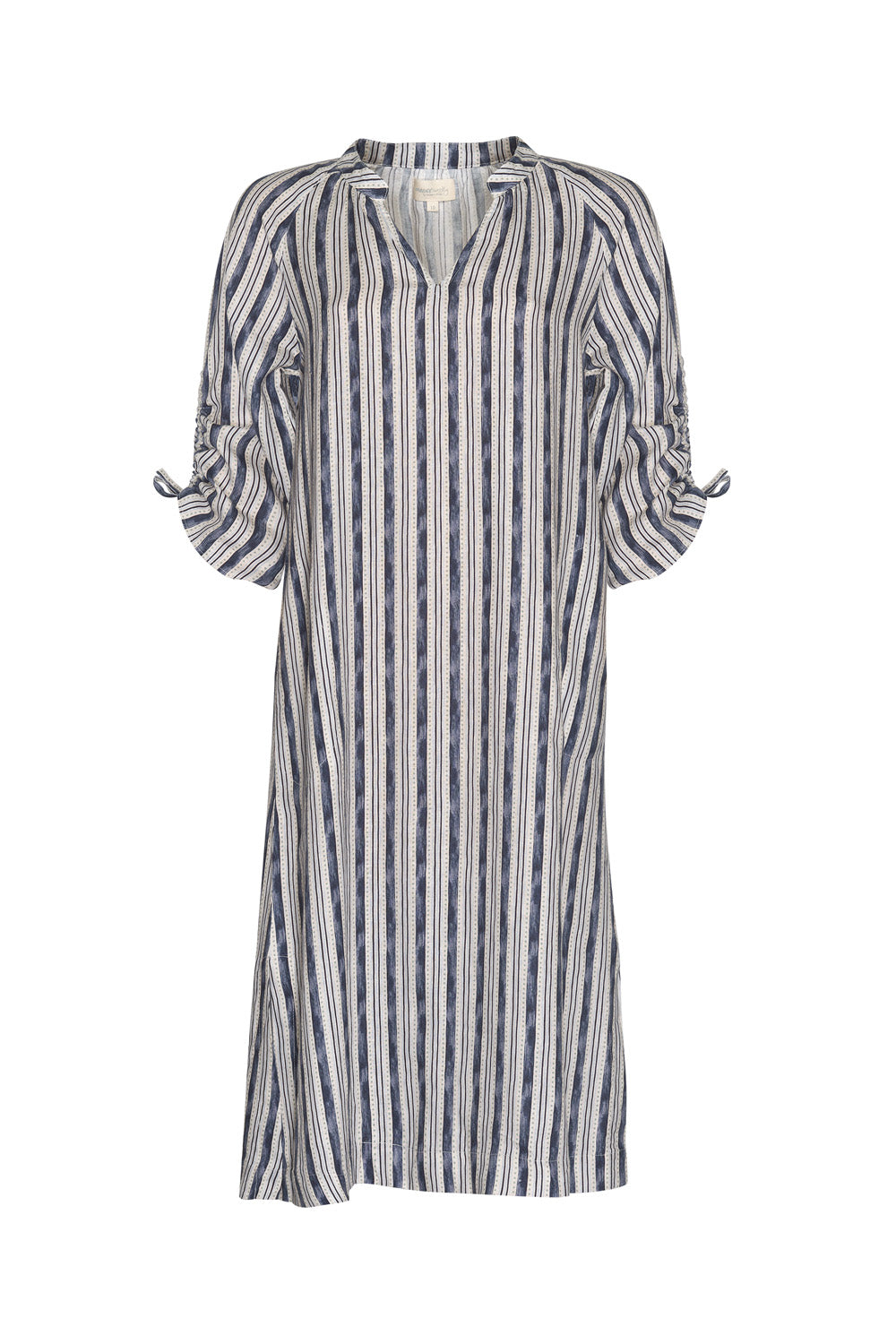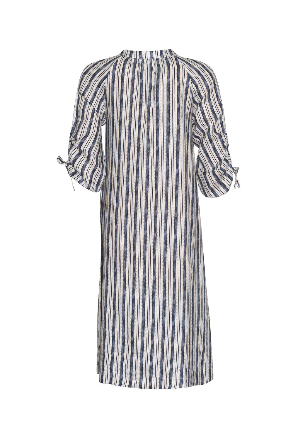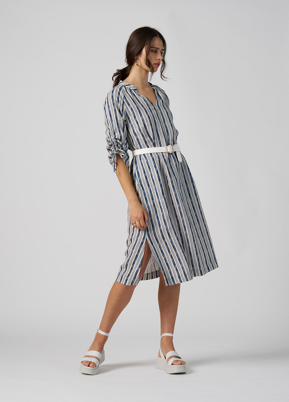 A-line midi dress with a V-neckline and 3/4 sleeves that can be ruched and tied, with stitched down side pockets and side splits.