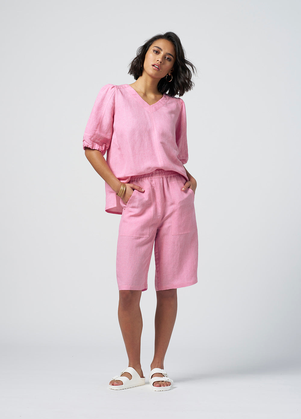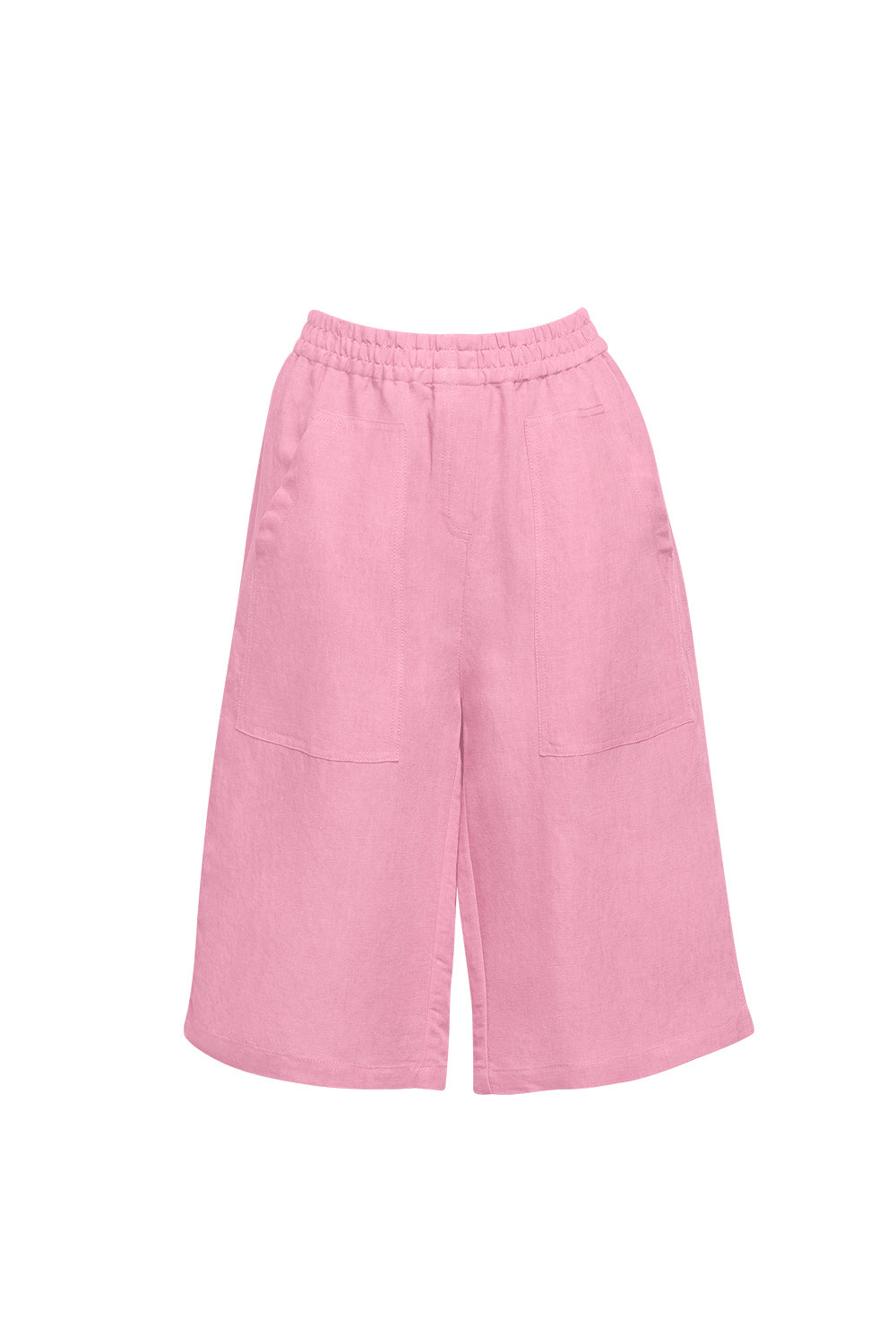 Below the knee length short in a linen blend, with an elasticated waistband, featuring top stitched front patch pockets.