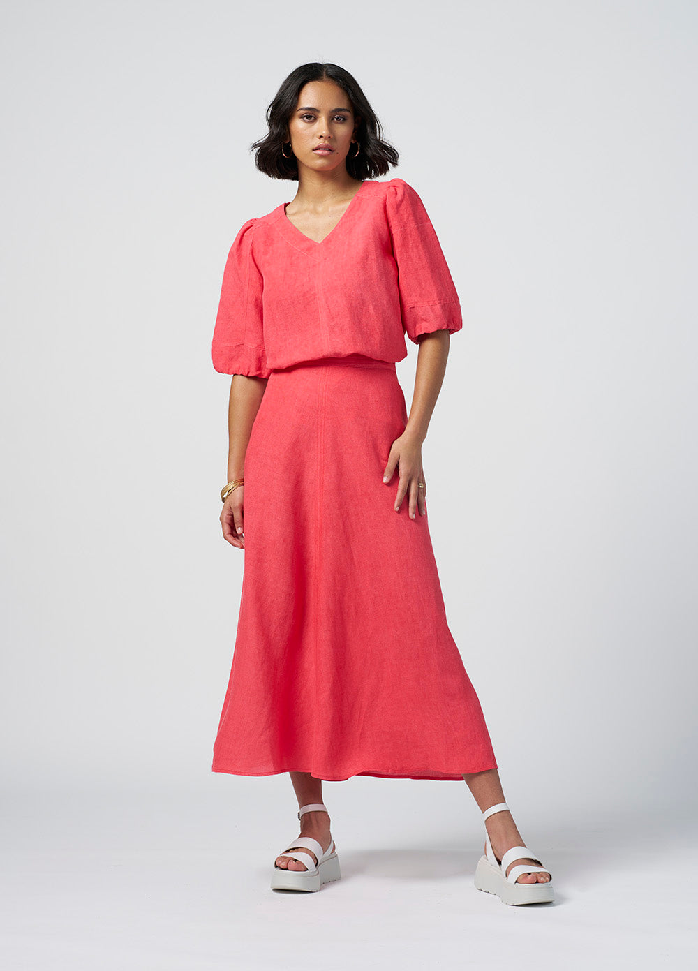 A line skirt in a linen blend with a flat front waistband, and elasticated back waist, with a centre back invisible zip.